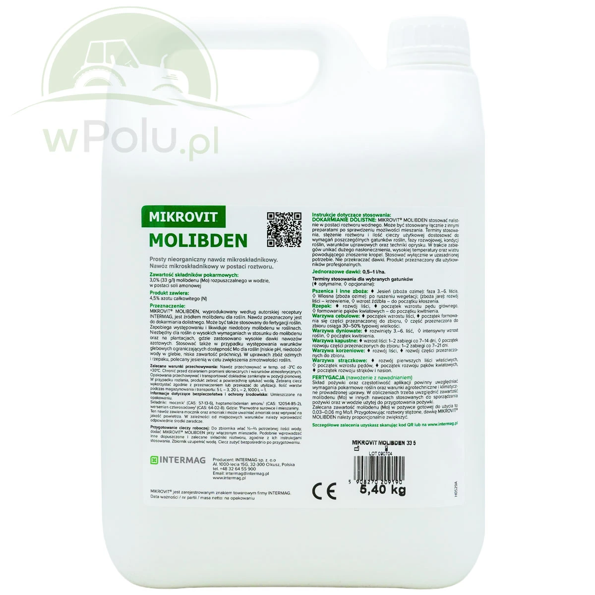 Płynny nawóz z molibdenem, w formie łatwo i szybko dostępnej dla roślin do stosowania dolistnego oraz do sporządzania pożywki do fertygacji upraw. Nawóz korzystnie wpływa na jakość i wielkość plonu, m.in. wpływa na większą produkcję biomasy, lepsze parametry jakościowe plonu, wspomaga wiązanie azotu atomsferycznego w roślinach, bierze udział w prawidłowej budowie organów wegetatywnych roślin, poprawia zimotrwałość roślin oraz zwiększa ich odporność na stresy.