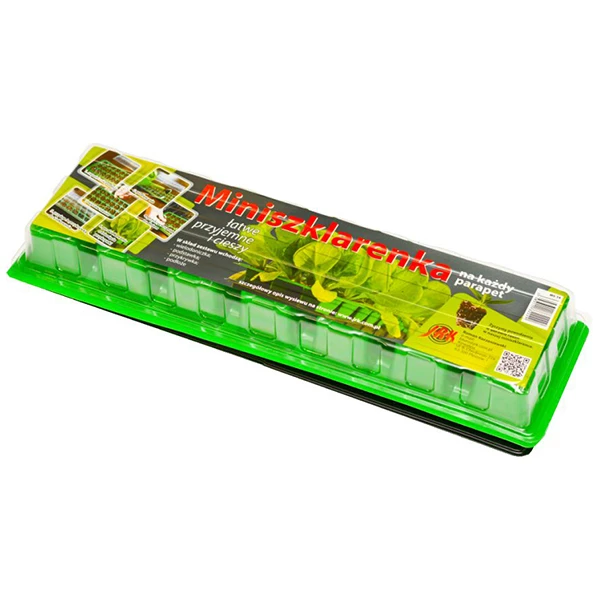 Miniszklarenka firmy JRK to mała szklarnia domowa, przeznaczona do wysiewu nasion i ukorzeniania się sadzonek. Zawiera 14 komórek, każda o wymiarach zewnętrznych 160 × 525 mm. Jej zadaniem jest stworzenie odpowiednich warunków mikroklimatycznych dla rozwoju młodych roślin. Wykonana z trwałych materiałów, zapewnia łatwość w obsłudze i jest odpowiednia zarówno dla początkujących, jak i doświadczonych ogrodników. Jest lekka i pasuje na każdy parapet.
