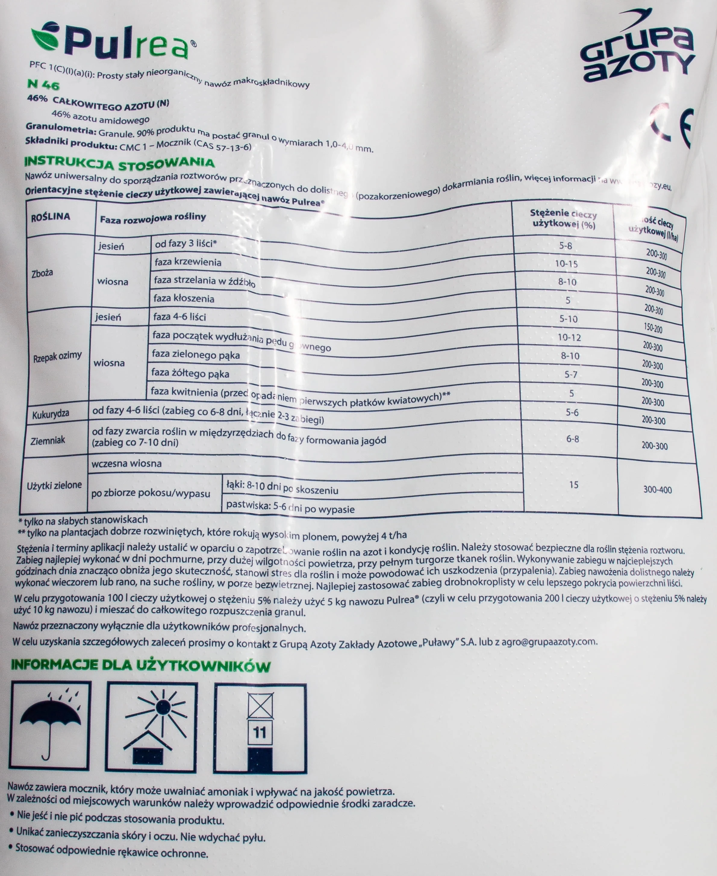 Mocznik Pulrea® przeznaczony jest do nawożenia wszystkich roślin uprawy polowej, użytków zielonych, roślin warzywniczych, kwiatowych, drzew i krzewów owocowych oraz trawników. Wysoka koncentracja azotu w formie amidowej zapewnia długotrwałe i równomierne działanie, sprzyjające prawidłowemu wzrostowi i rozwojowi roślin.