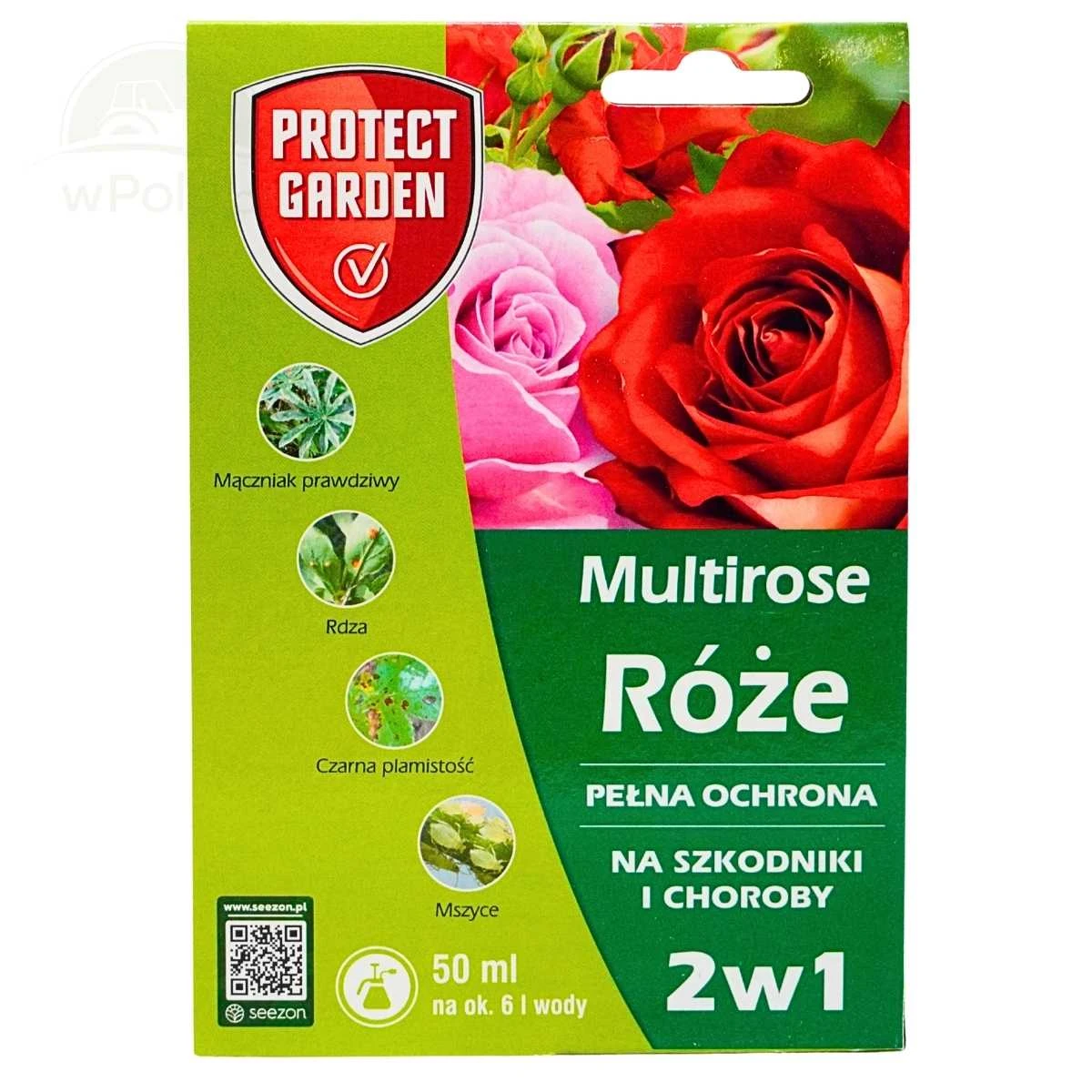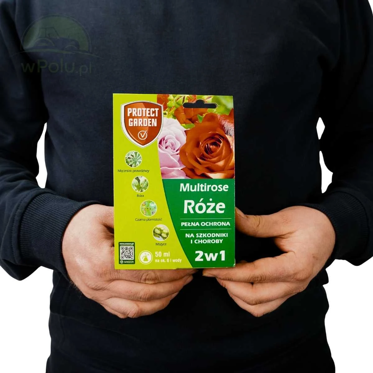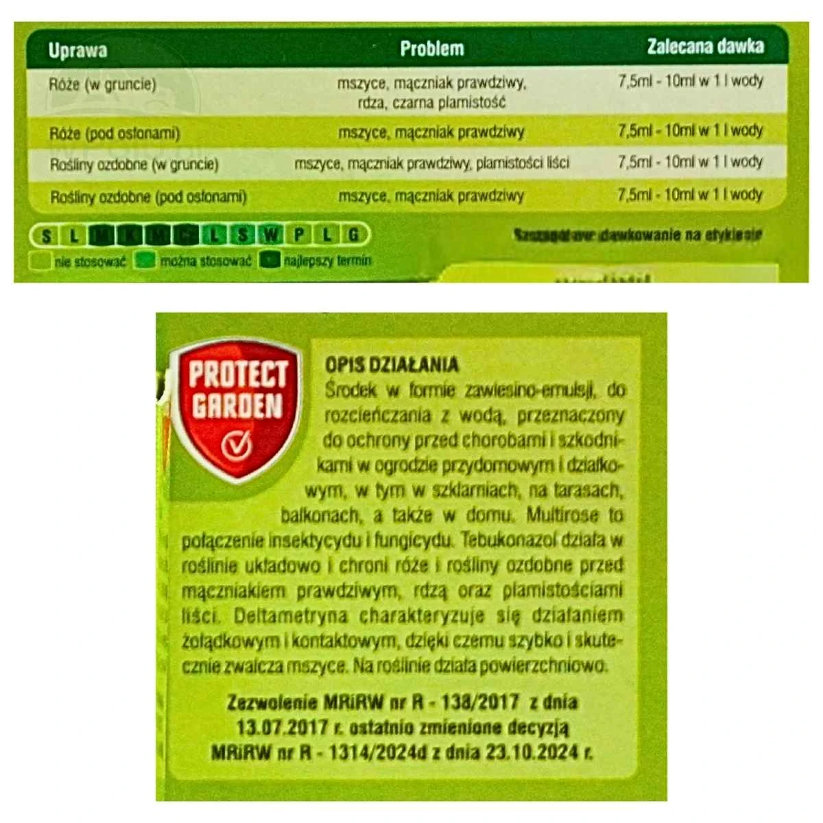 Multirose Róża, to produkt przeznaczony do ochrony przed szkodnikami i chorobami w ogrodach przydomowych, szklarniach, tarasach balkonach, a także w domu. Za jego pomocą można uniknąć takich problemów jak mszyce, mączniak prawdziwy czy osadzanie się rdzy na płatkach i liściach. Produkt posiada dwa składniki aktywne, dzieki czemu działa układowo i kontaktowo. Substancje zawarte w produkcie osłaniają roślinę, nie szkodząc jej zdrowiu i wyglądowi.