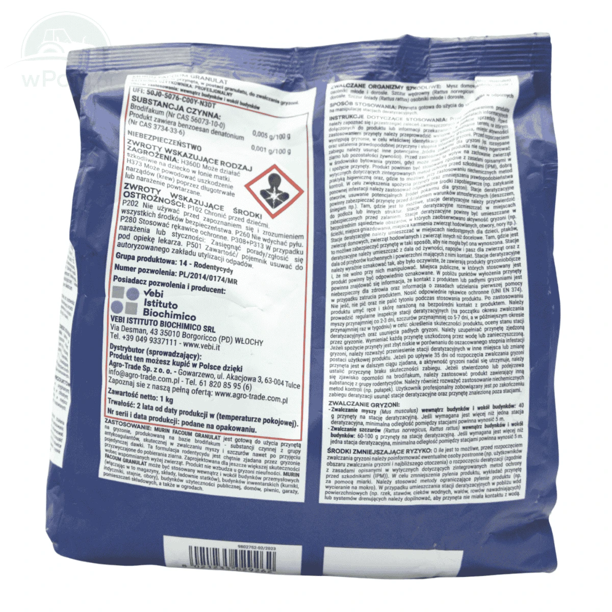 Facoum Granulat marki Murin przeznaczony jest do stosowania zarówno wewnątrz, jak i wokół różnego rodzaju obiektów. Może być używany w budynkach przemysłowych, takich jak magazyny, składy czy ładownie statków, a także w budynkach inwentarskich, w tym kurnikach, indycznikach, stajniach i oborach. Produkt sprawdzi się również w budynkach użyteczności publicznej, domach mieszkalnych, piwnicach, garażach, pomieszczeniach składowych oraz w ogrodach, umożliwiając skuteczną kontrolę populacji gryzoni w różnych warunkach.