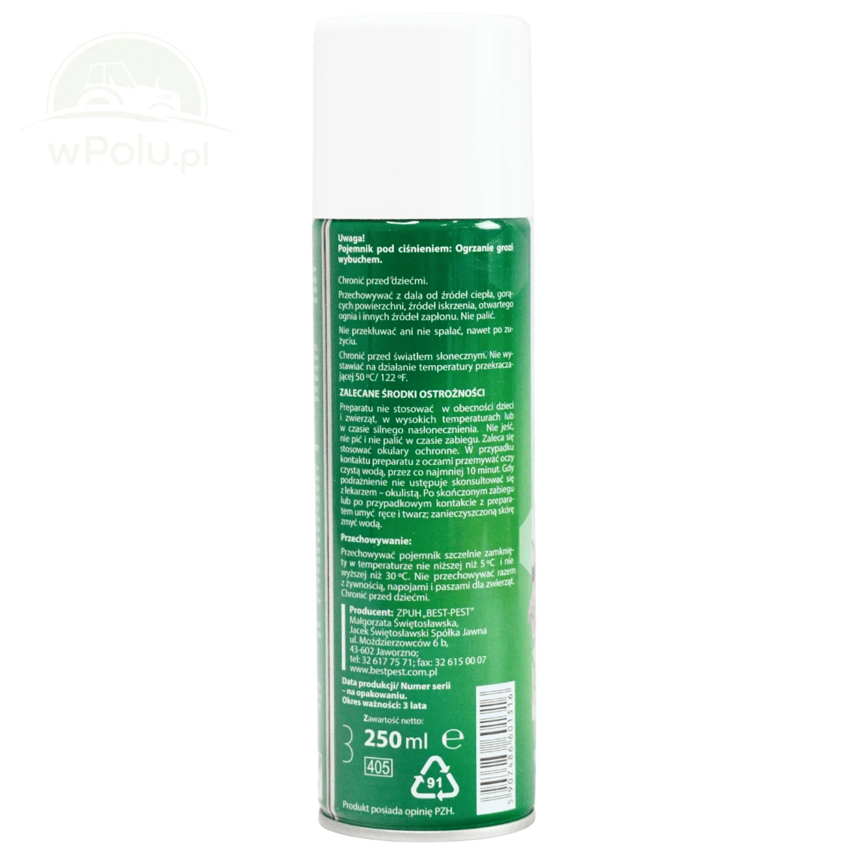 Preparat stosować po wystąpieniu pierwszych szkodników. Zabieg wykonać wcześnie rano lub późnym wieczorem tj. przed lub po oblocie pszczół, najlepiej w czasie niskiej wilgotności powietrza (w okresie deszczowym), ponieważ preparat powinien szybko wyschnąć na roślinie. Aerozolować dokładnie całą roślinę z odległości 30 cm tak, aby była wilgotna, ale żeby nie tworzyły się ściekające krople. Dokładnie pokryć preparatem również dolną stronę liści. Unikać nanoszenia preparatu na płatki kwiatów. W razie koniczności zabieg powtórzyć po 7 – 14 dniach, po zauważeniu szkodników. Całkowicie opróżnione opakowanie traktować jako odpady komunalne.