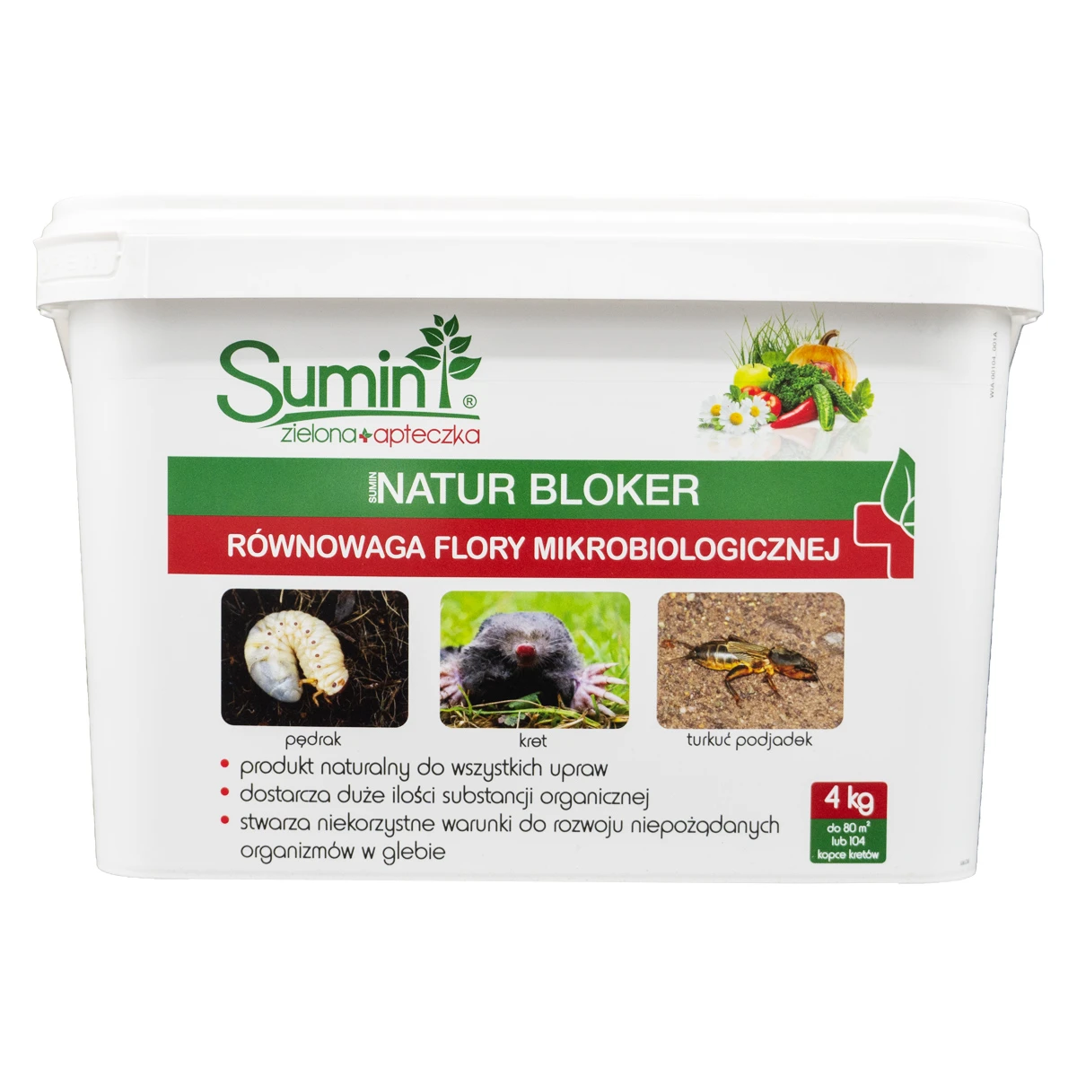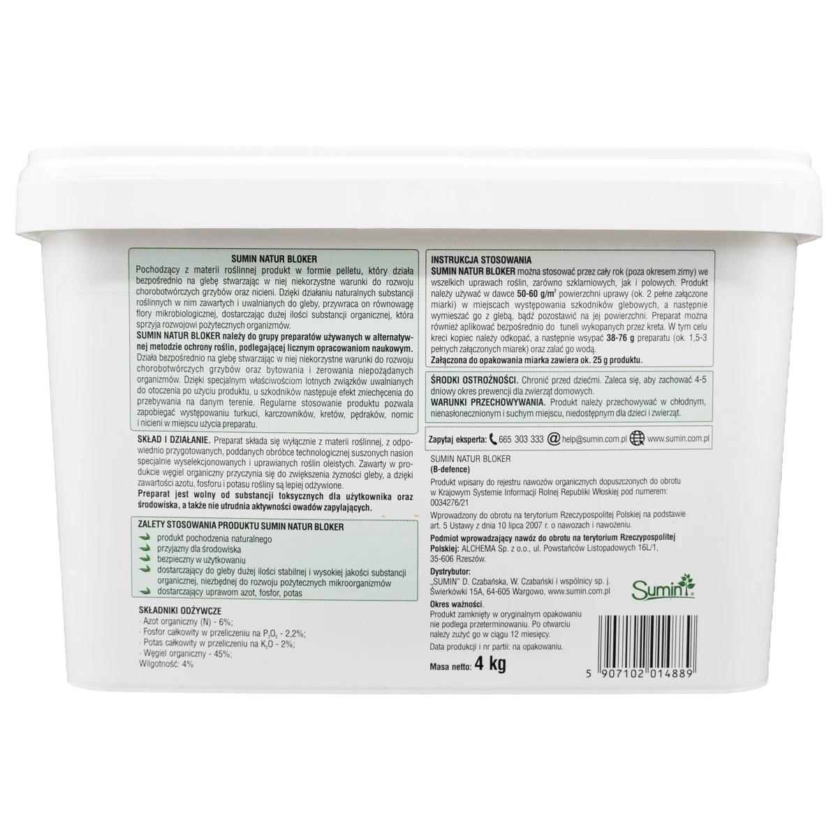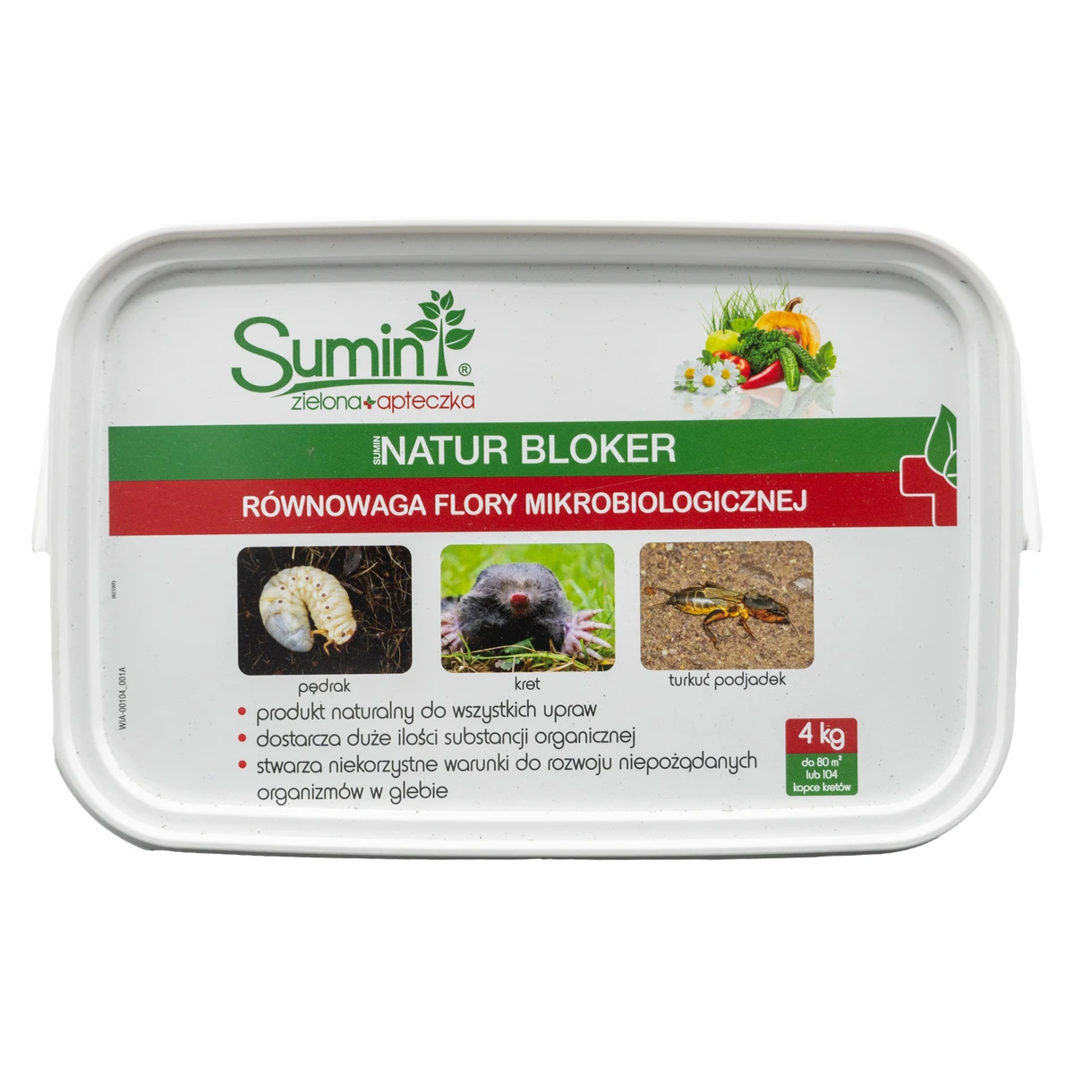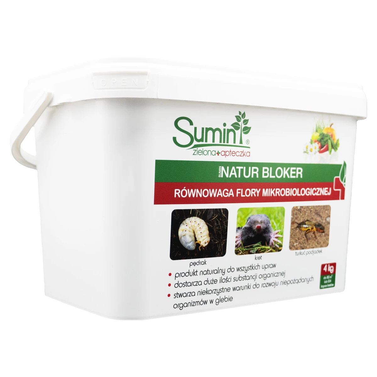 Sumin Natur Bloker to naturalny i bezpieczny preparat w formie pelletu, wytwarzany w całości z materii roślinnej. Produkt działa bezpośrednio na glebę, tworząc w niej niekorzystne warunki do rozwoju chorobotwórczych grzybów oraz bytowania i żerowania szkodników, takich jak turkuć podjadek, krety, nornice, pędraki czy nicienie. Skład oparty na naturalnych surowcach zapewnia skuteczną ochronę upraw, jednocześnie wspierając zdrową strukturę gleby.