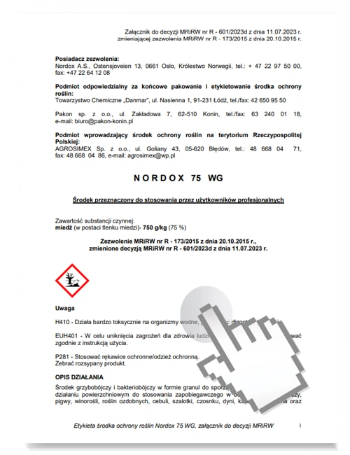 Pełne stosowanie znajdziesz w etykiecie środka ochrony roślin Nordox 75 WG poniżej.