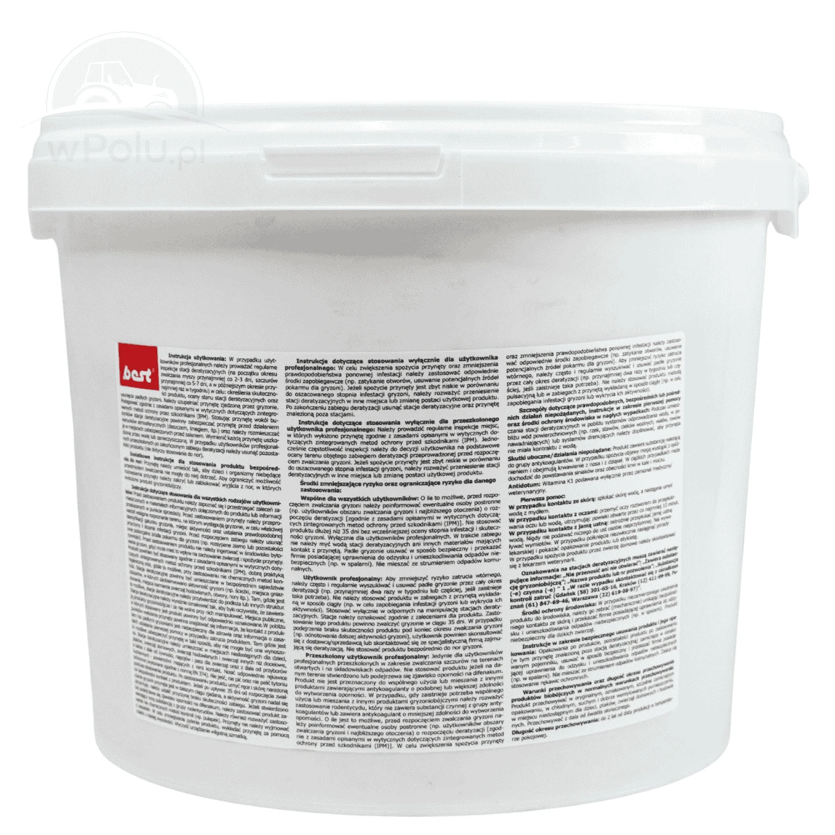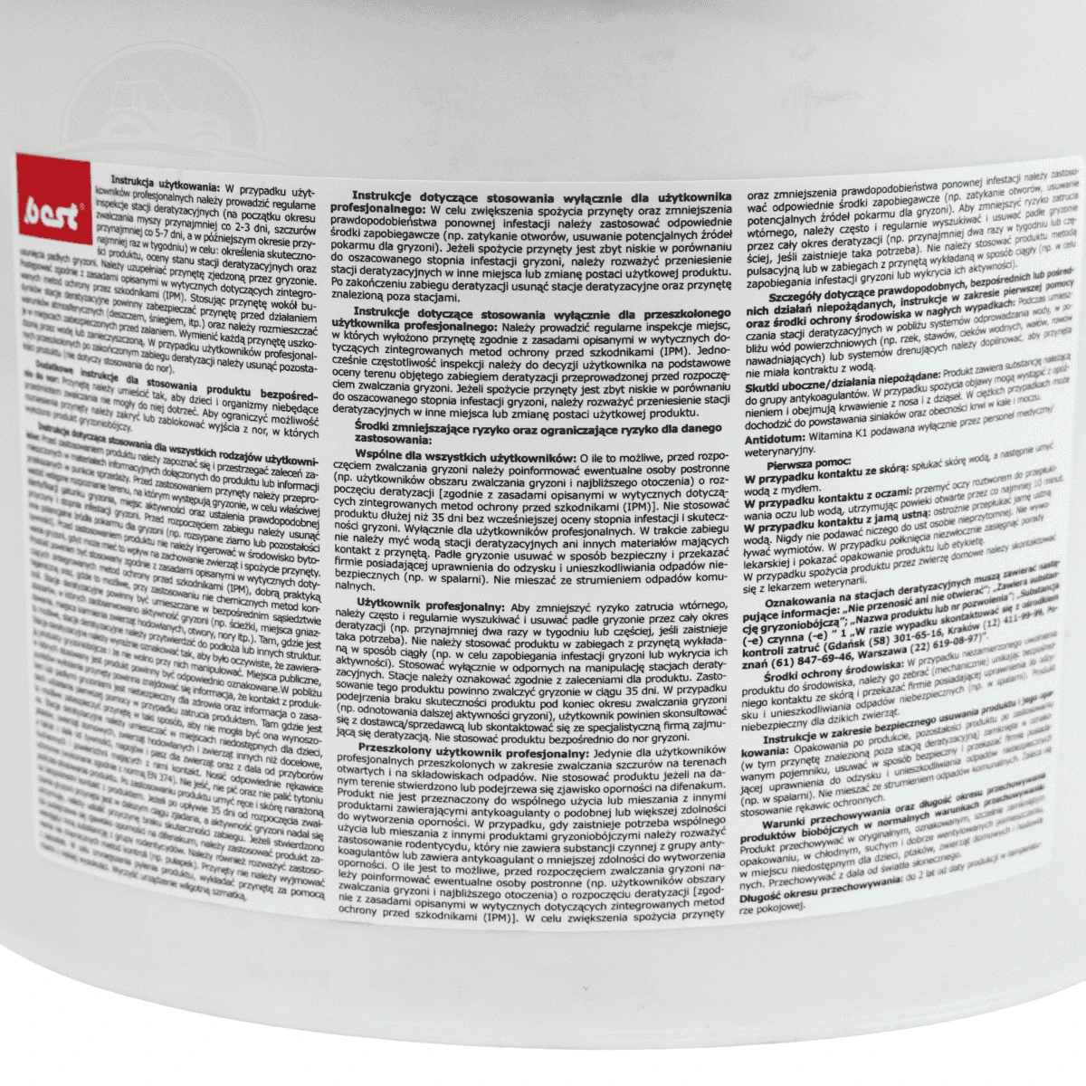 PRZYNĘTA GOTOWA DO UŻYCIA W FORMIE GRANULATU (PRODUKT BIOBÓJCZY - RODENTYCYD) - ZWALCZA SZKODNIKI POLNE Gotowa do użycia przynęta na gryzonie w formie granulatu. Przeznaczona do zwalczania szczurów i myszy wewnątrz oraz wokół budynków przez użytkowników profesjonalnych oraz profesjonalnie przeszkolonych w tym zakresie, a także do zwalczania szczurów na terenach otwartych oraz na składowiskach odpadów przez użytkowników profesjonalnych przeszkolonego w tym zakresie. Środek należy do rodentycydów, a więc gryzoniobójczych preparatów do higieny sanitarnej.