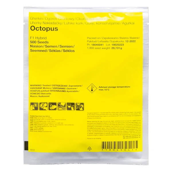 Ogórek Octopus F1 to plenna mieszańcowa odmiana średniowczesna o przewadze kwiatów żeńskich. Odmiana grubobrodawkowa doskonałej jakości i zdrowotności oraz dająca wysoki plon przy niskich nakładach na ochronę. Ogórek Octopus charakteryzuje się równomiernym plonowaniem i szybkim wzrostem. Wysoki odsetek plonu nadaje się na handel. Owoc smukły i jasny, bez tendencji do przerastania, o proporcji długości do szerokości 3:1. Na skórce wzdłuż owocu widoczne są jasne smugi oraz rozjaśniony koniec.