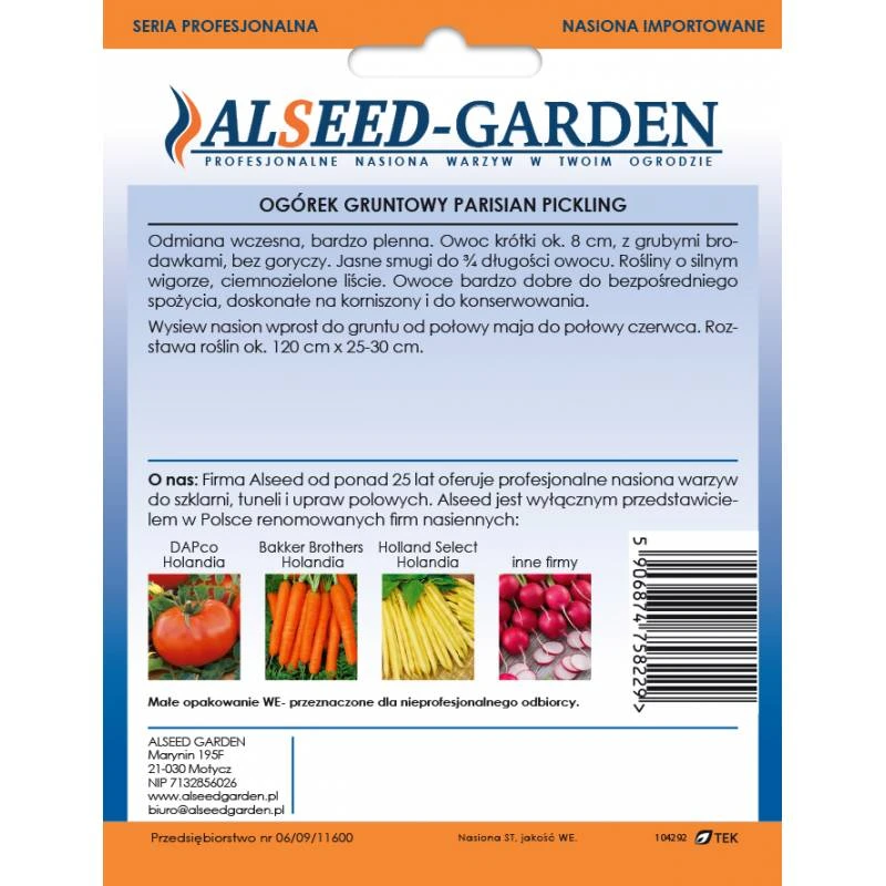 Ogórek gruntowy Piccolo verde di parigi to odmiana wczesna, bardzo plenna. Charakteryzuje się krótkim owocem ok. 8 cm, z grubymi brodawkami, bez goryczy o ciemnozielonych liściach i silnym wigorze. Jasne smugi do ¾ długości owocu. Piccolo verde di parigi to idealna odmiana do bezpośredniego spożycia, na korniszony i do konserwowania.