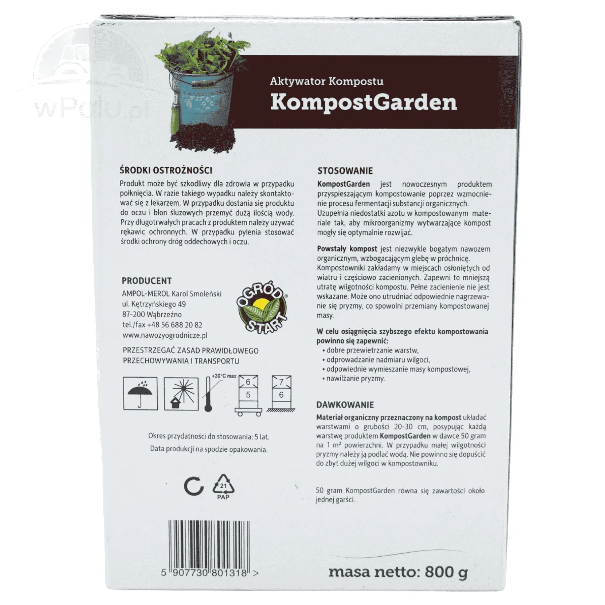 Kompost Garden to granulowany preparat stworzony w celu przyspieszenia procesu kompostowania. Jego unikalna formuła skutecznie uzupełnia niedobory azotu w materiale kompostowym, stwarzając optymalne warunki dla mikroorganizmów odpowiedzialnych za tworzenie kompostu. Dzięki regularnemu stosowaniu Kompost Garden, możesz szybko uzyskać bogaty w składniki organiczne nawóz, który doskonale wzbogaci glebę, sprzyjając zdrowemu wzrostowi roślin. Stosowanie preparatu jest niezwykle łatwe – wystarczy posypać nim kolejne warstwy materiału organicznego. Jego wysoka wydajność oraz długotrwałe działanie zapewniają skuteczne wsparcie dla procesu kompostowania, bez wpływu na ostateczną jakość nawozu organicznego. Dzięki Kompost Garden możesz cieszyć się korzyściami kompostu znacznie szybciej.