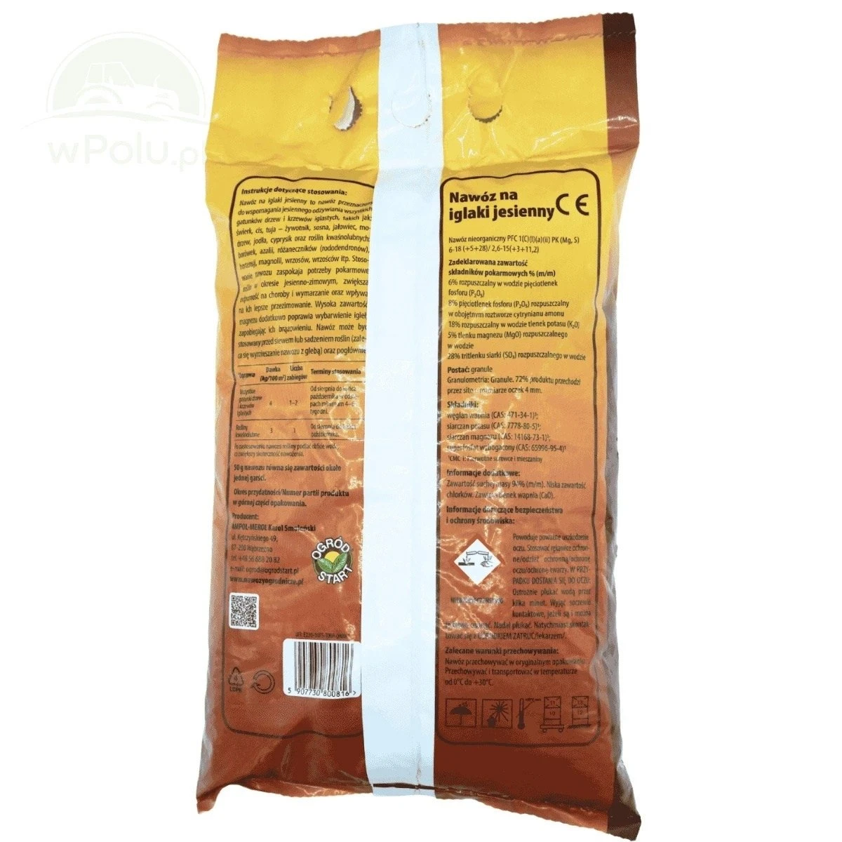 Środki ostrożności: Nawóz należy stosować zgodnie z zaleceniami, unikać przedawkowania i nie stosować bezpośrednio przed intensywnymi opadami. Nadmiar nawozu może prowadzić do zasolenia gleby i brązowienia igieł. Przy stosowaniu przedsiewnym należy zawsze dokładnie wymieszać nawóz z glebą.