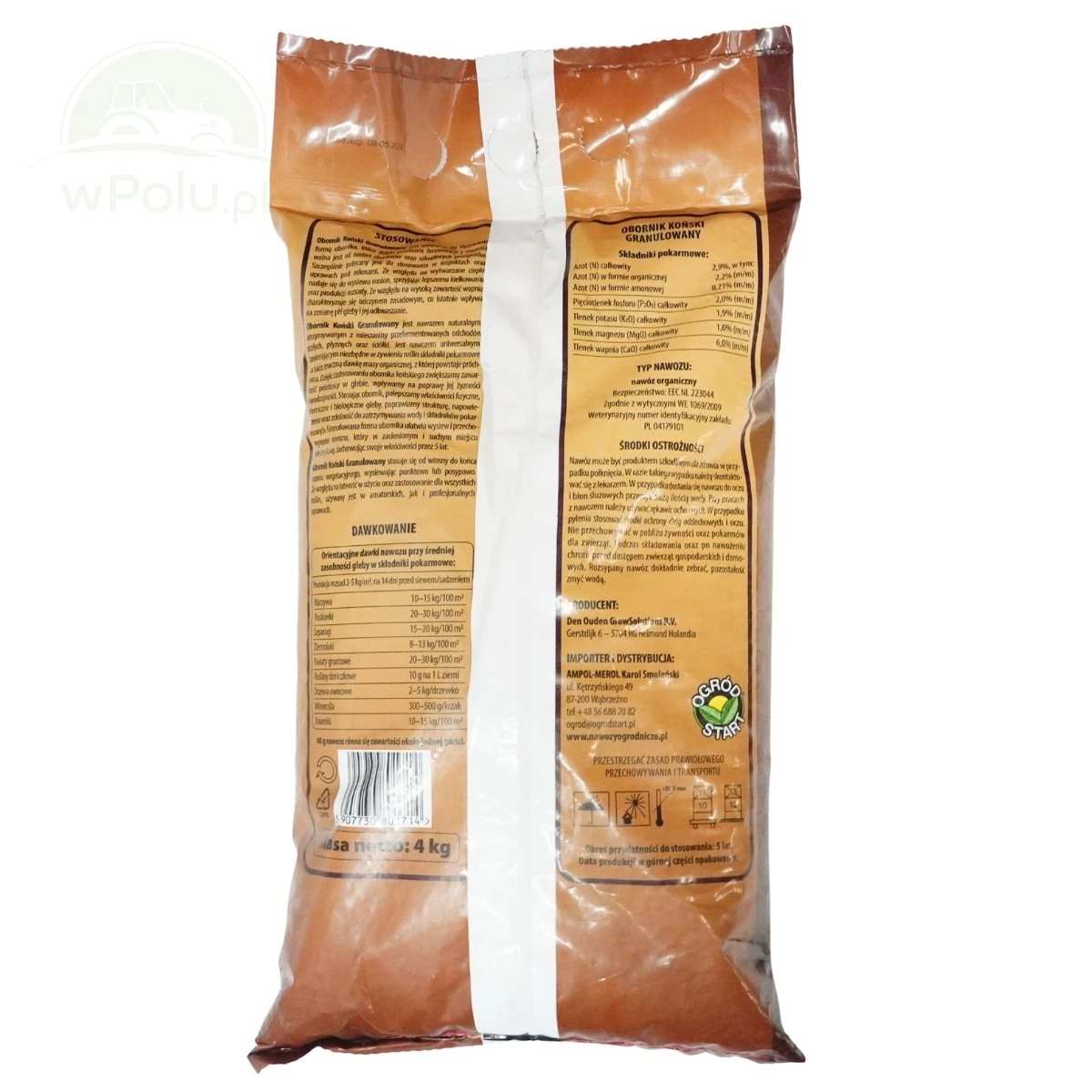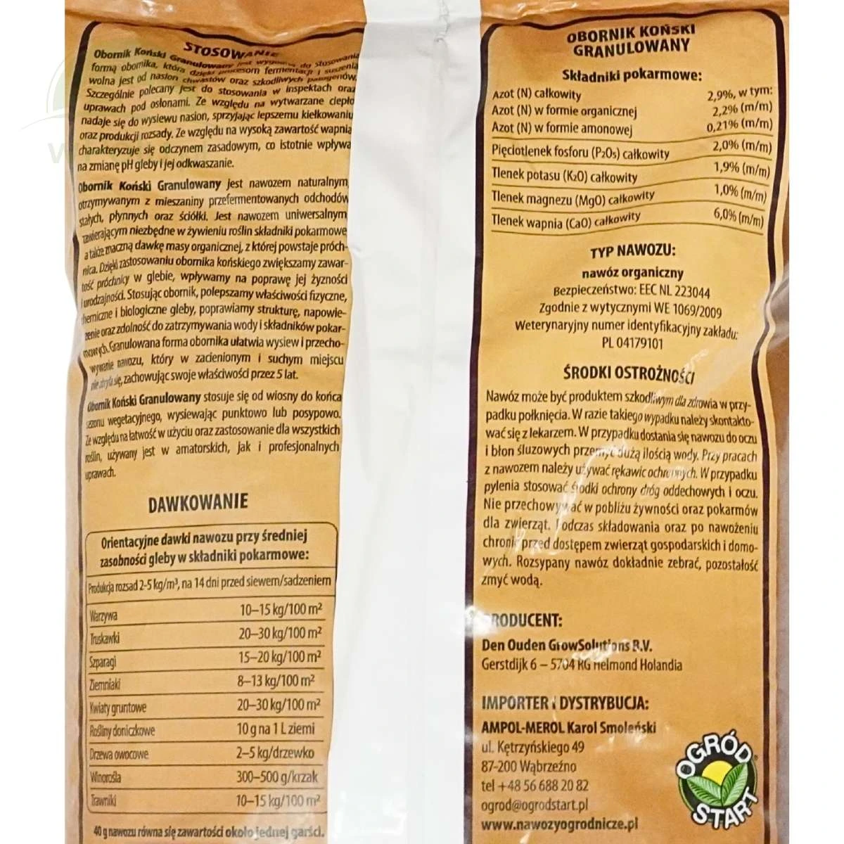 Obornik Koński to kompleksowy uniwersalny i naturalny nawóz granulowany, który sprawi, że rośliny będą zdrowsze i będą obficie plonować. Nawóz dostarcza wszystkich niezbędnych składników odżywczych, poprawiając żyzność gleby i wzrost roślin. Gleba nawożona obornikiem końskim ma lepsze właściwości fizyczne, chemiczne oraz biologiczne. Jego łatwa aplikacja oraz brak nieprzyjemnego zapachu sprawiają, że praca w ogrodzie jest przyjemna. Zaletą obornika końskiego jest możliwość stosowania przez większość roku, jest pozbawiony nasion chwastów oraz patogenów,