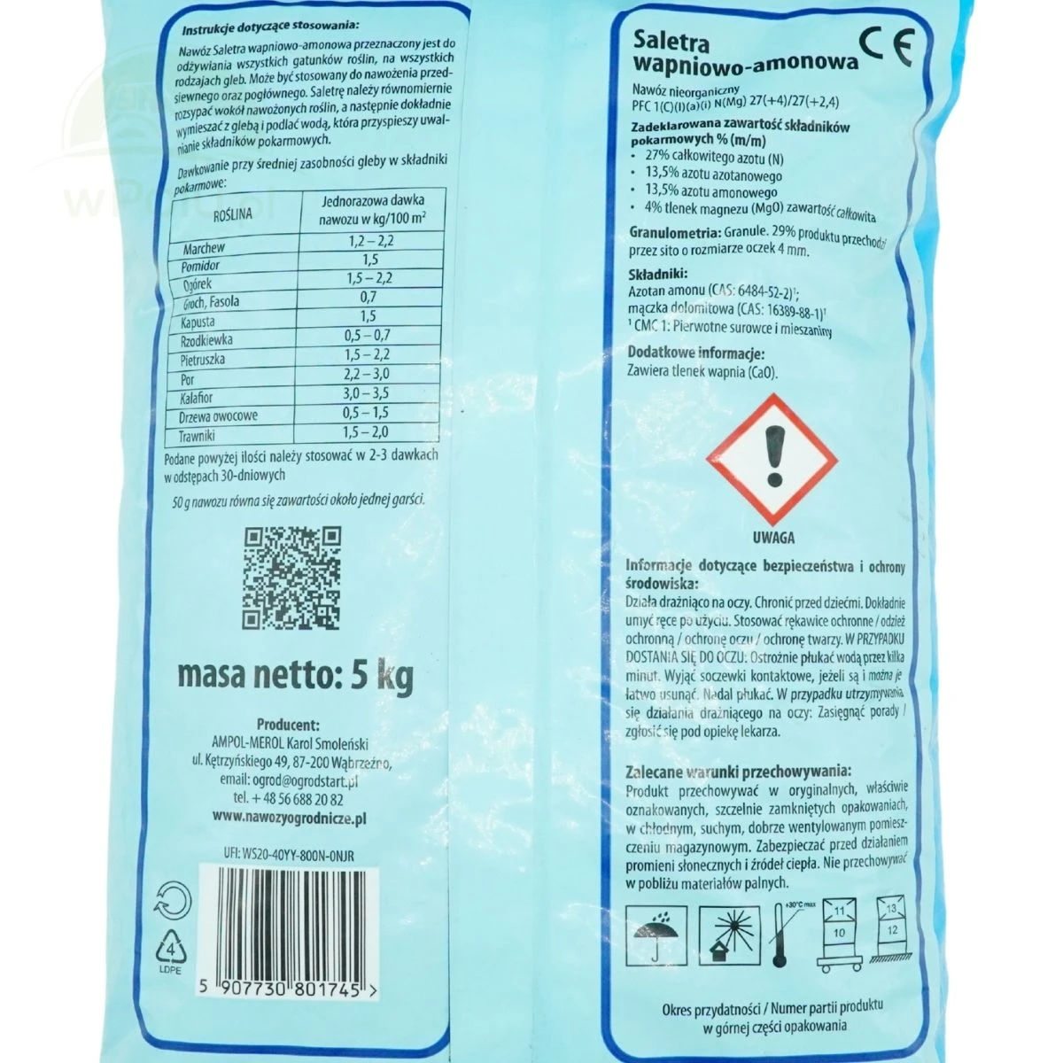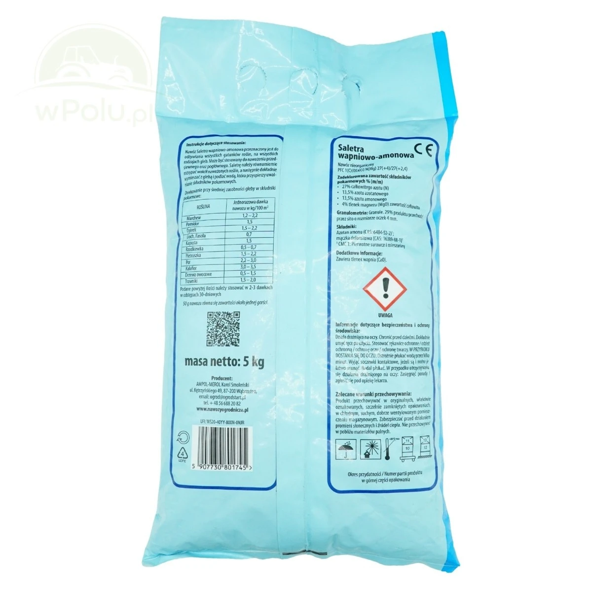 Saletra Wapniowo Amonowa w opakowaniu o pojemności 5 kg wystarczy od 143 m2 do 1000 m2 w zależności od rodzaju uprawy i dawki.