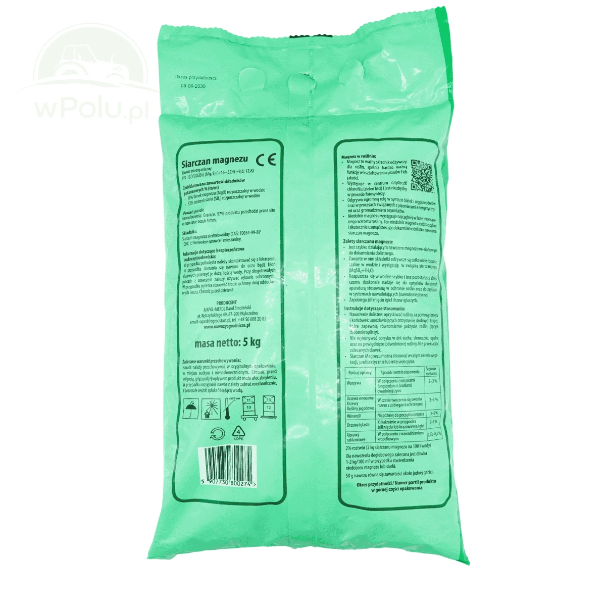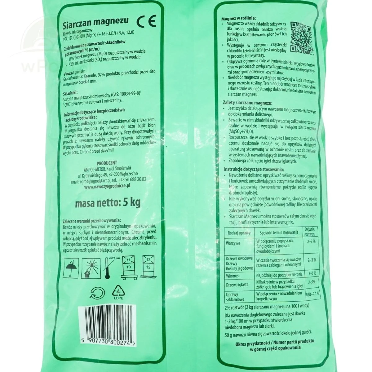 Siarczan magnezu to uniwersalny nawóz, który skutecznie usuwa niedobory siarki i magnezu w roślinach ogrodowych i szklarniowych. Jego całkowita rozpuszczalność sprawia, że doskonale sprawdza się zarówno podczas nawożenia doglebowego, jak i dolistnego, można go wykorzystać z systemami kropelkowymi i zraszaczami. Zawartość siarki koryguje pH gleby, a magnez wpływa korzystnie na barwę liści, igieł oraz trawników, zapobiegając brązowieniu igieł. Siarczan magnezu to niezawodny partner w pielęgnacji roślin, wspierający ich zdrowy wzrost i obfite plony.