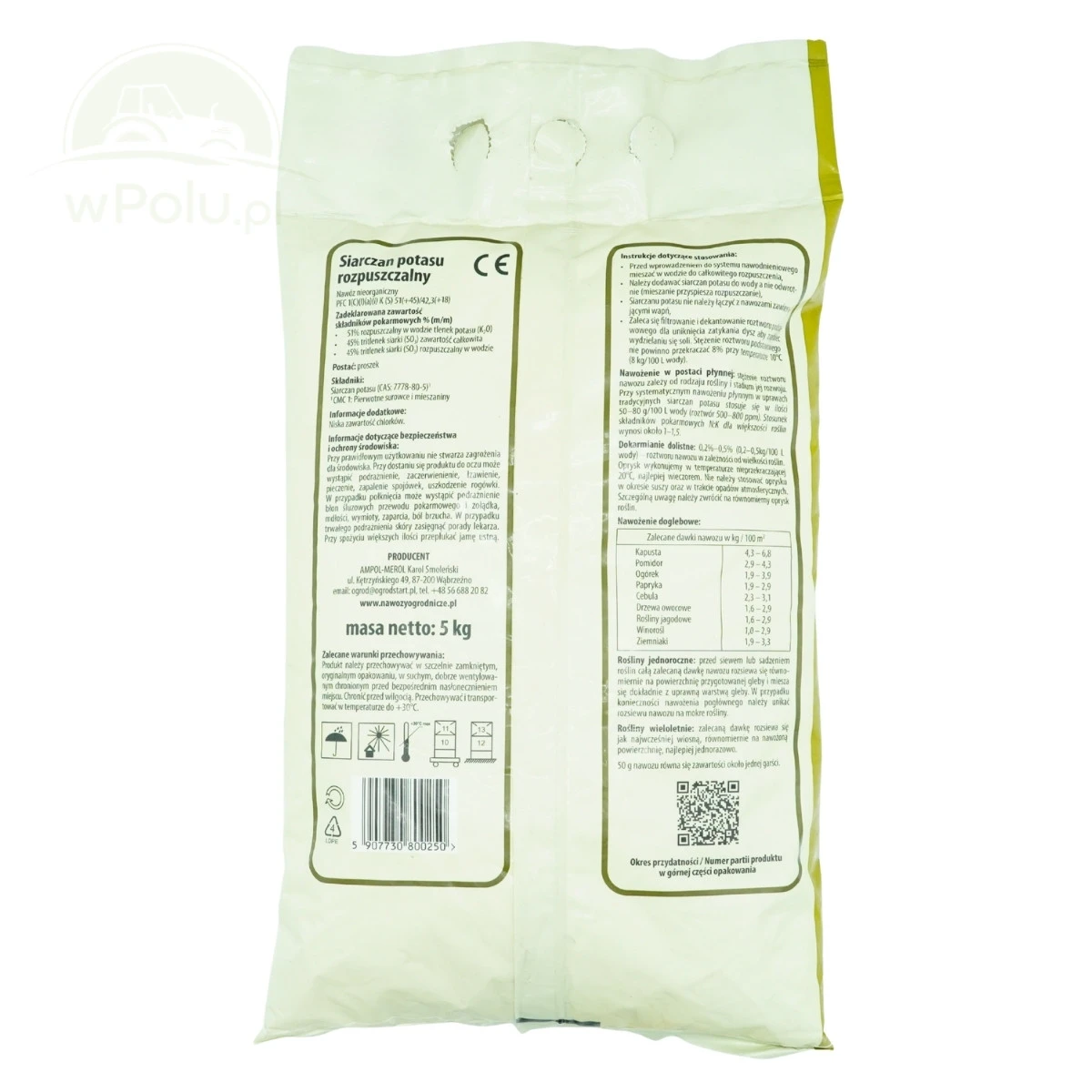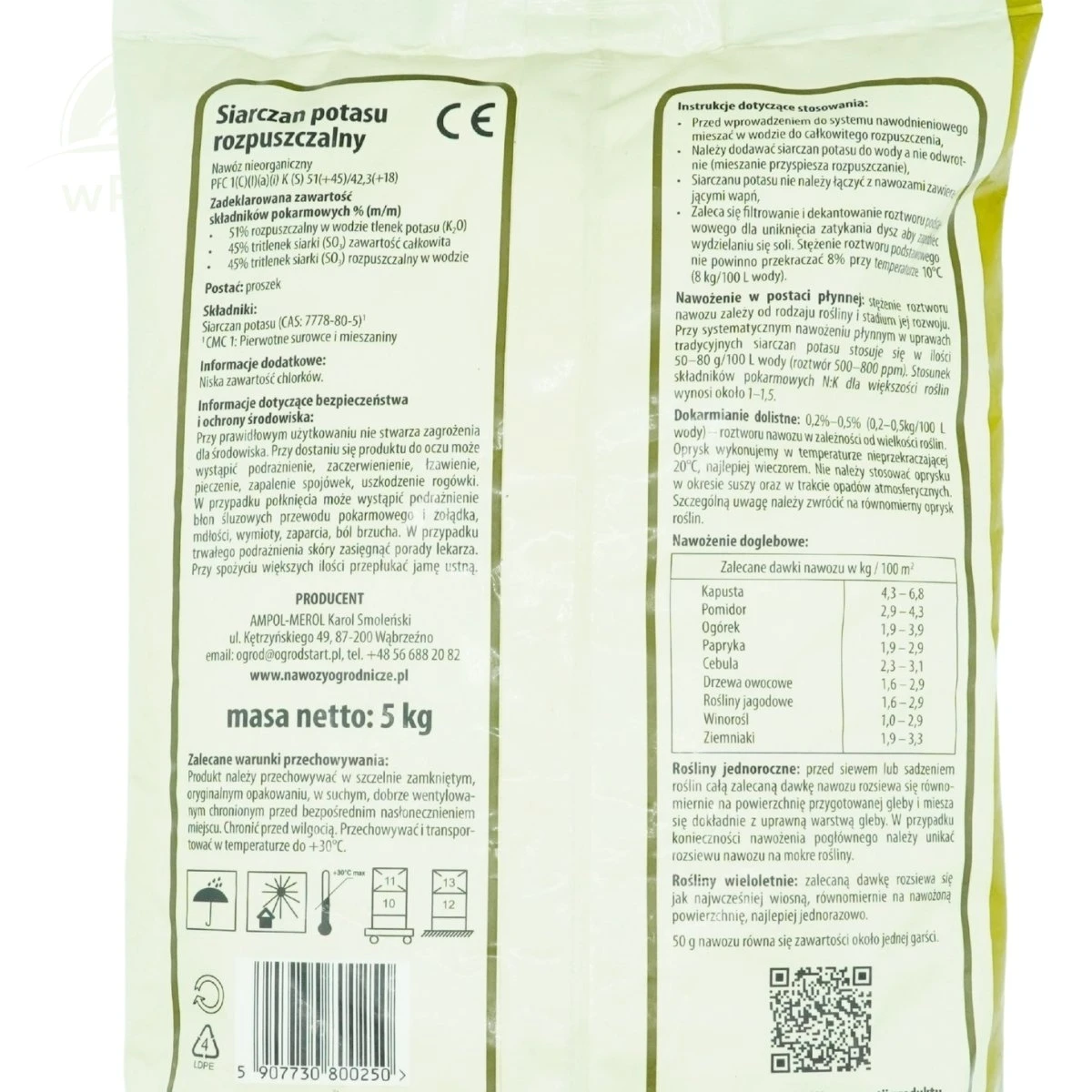 Nawóz rozpuszczalny o niskiej zawartości chlorków, dzięki czemu dobrze sprawdzi się jako źródło potasu dla roślin wrażliwych na chlor (warzywa, rośliny jagodowe, ozdobne i iglaste). Siarczan Potasu Ogród Start jest całkowicie naturalny, wydobywanym z naturalnych złóż morskich. Nawóz bardzo szybko się rozkłada, dzięki czemu jest łatwo dostępny dla roślin. Jest całkowicie rozpuszczalny w wodzie, dzięki czemu potas oraz siarka są maksymalnie wykorzystane przez rośliny. Nadaje się do stosowania w intensywnych systemach uprawy (szklarnie, tunele foliowe). Dzięki formie granulatu jest wygodny w stosowaniu.