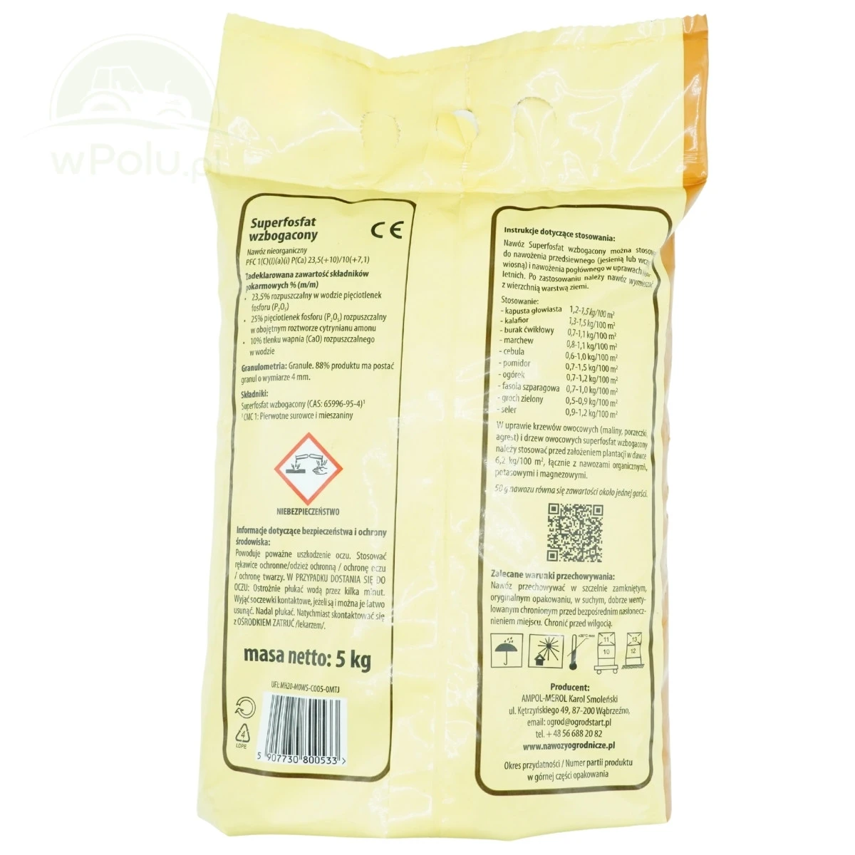Opakowanie superfosfatu Ogród Start o wadze 5 kg wystarcza maksymalnie na 500-1000 m2 powierzchni.