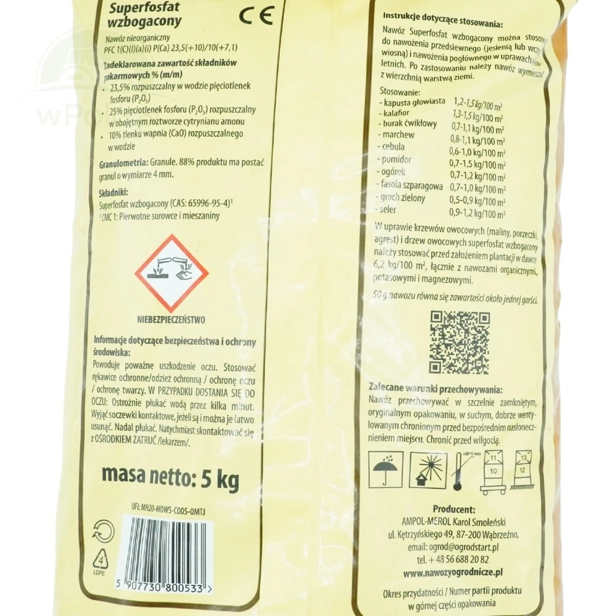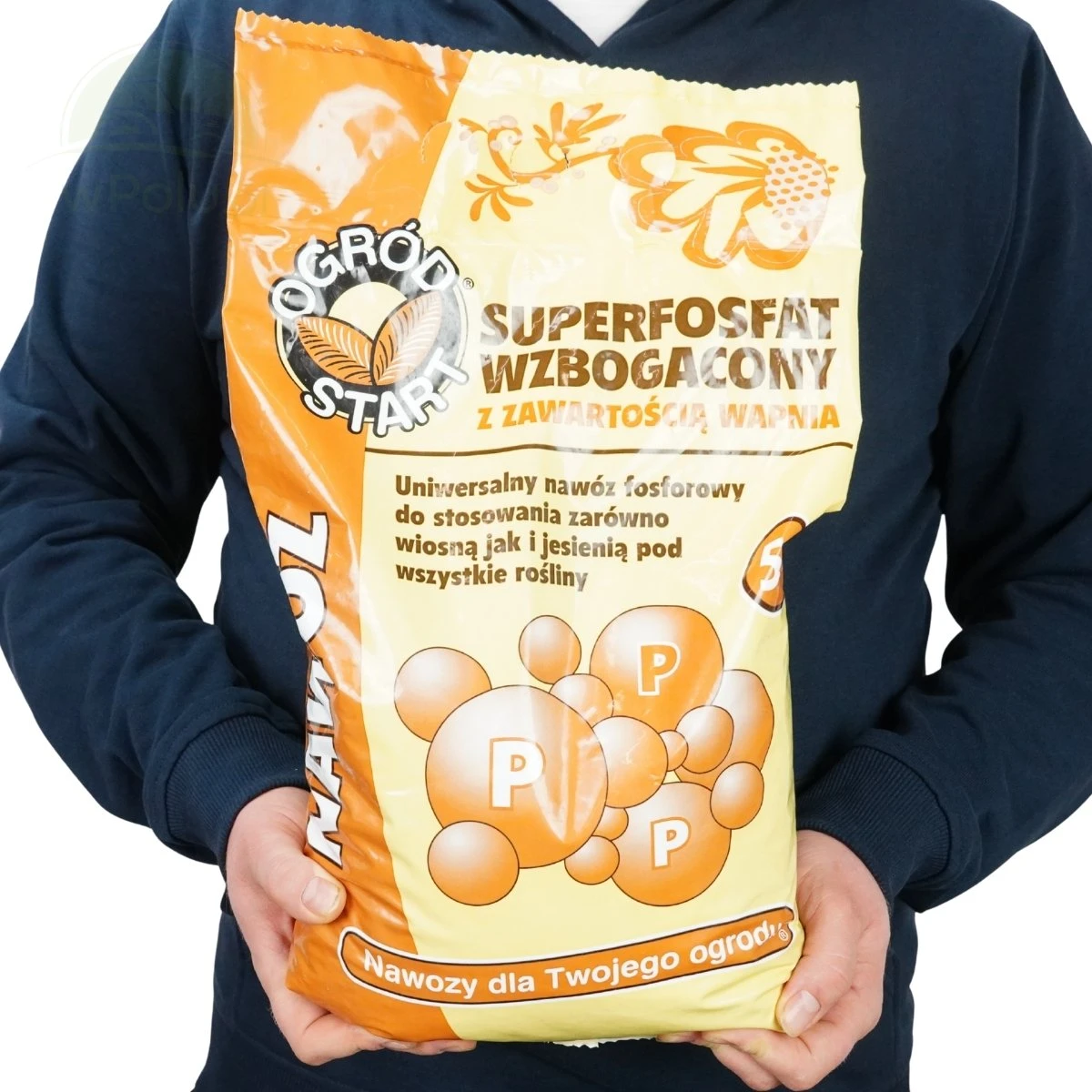 Superfosfat wzbogacony marki Ogród Start to uniwersalny granulowany nawóz posypowy przeznaczony do stosowania przedsiewnie oraz w trakcie sezonu wegetacyjnego. Jego głównym składnikiem jest fosfor, którego zawartość sięga aż 40%. Jest on jednym z podstawowych makroelementów niezbędnych do prawidłowego wzrostu, rozwoju oraz plonowania roślin. Fosfor obecny w nawozieie wspiera prawidłowy rozwój systemu korzeniowego, sprzyja efektywnej fotosyntezie oraz poprawia jakość białek, tłuszczów i węglowodanów w roślinie. Dodatkowo zawiera także wapń, który korzystnie wpływa na strukturę gleby oraz stabilizuje białka i enzymy roślinne, poprawiając ich funkcjonowanie.