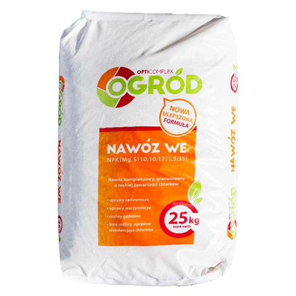Mineralny nawóz wieloskładnikowy z azotem, fosforem, potasem oraz siarką, z dodatkiem magnezu. OptiComplex Ogród charakteryzuje się niską zawartością chlorków, dzięki czemu może być z powodzeniem stosowany w uprawach, które ich nie tolerują.