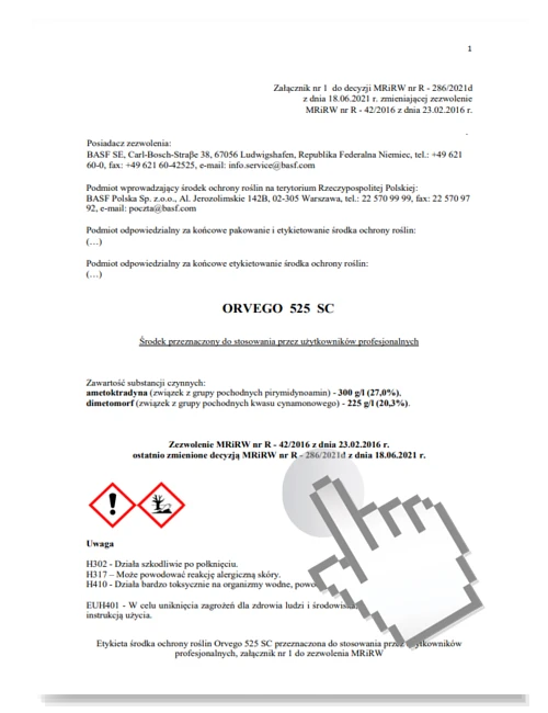 Pełne stosowanie znajdziesz w etykiecie środka ochrony roślin Orvego 525 SC poniżej.