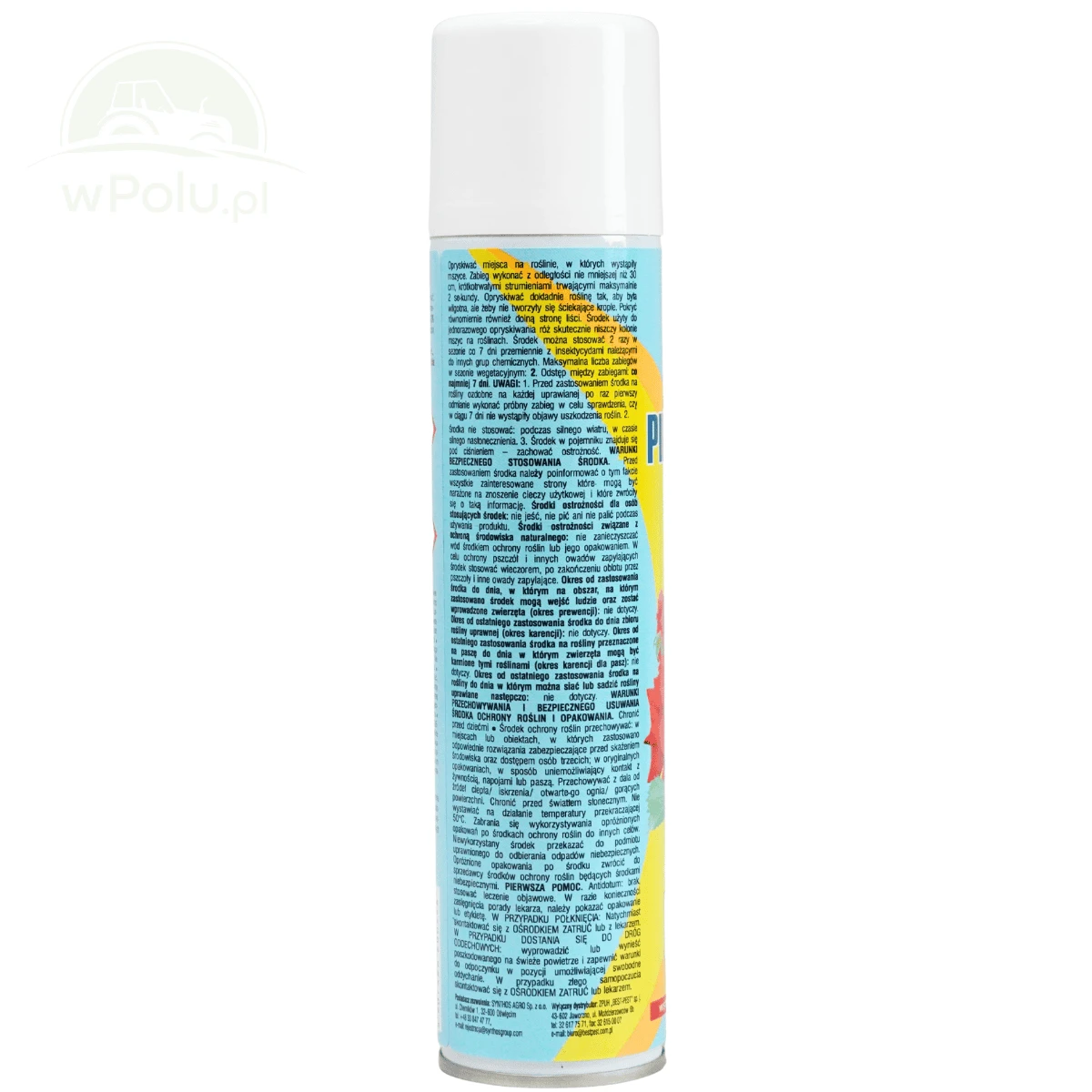 Aerozol można stosować zarówno w warunkach domowych, jak i w uprawach balkonowych, ogrodowych lub szklarniowych. Idealny do zwalczania mszyc na różach, pelargoniach, pomidorach czy ogórkach. Efekty widoczne są już po krótkim czasie od zastosowania, a forma gotowa do użycia eliminuje konieczność rozcieńczania lub mieszania. Środek najlepiej stosować przy bezwietrznej pogodzie, w godzinach porannych lub wieczornych, dokładnie opryskując rośliny z odległości około 30 cm.