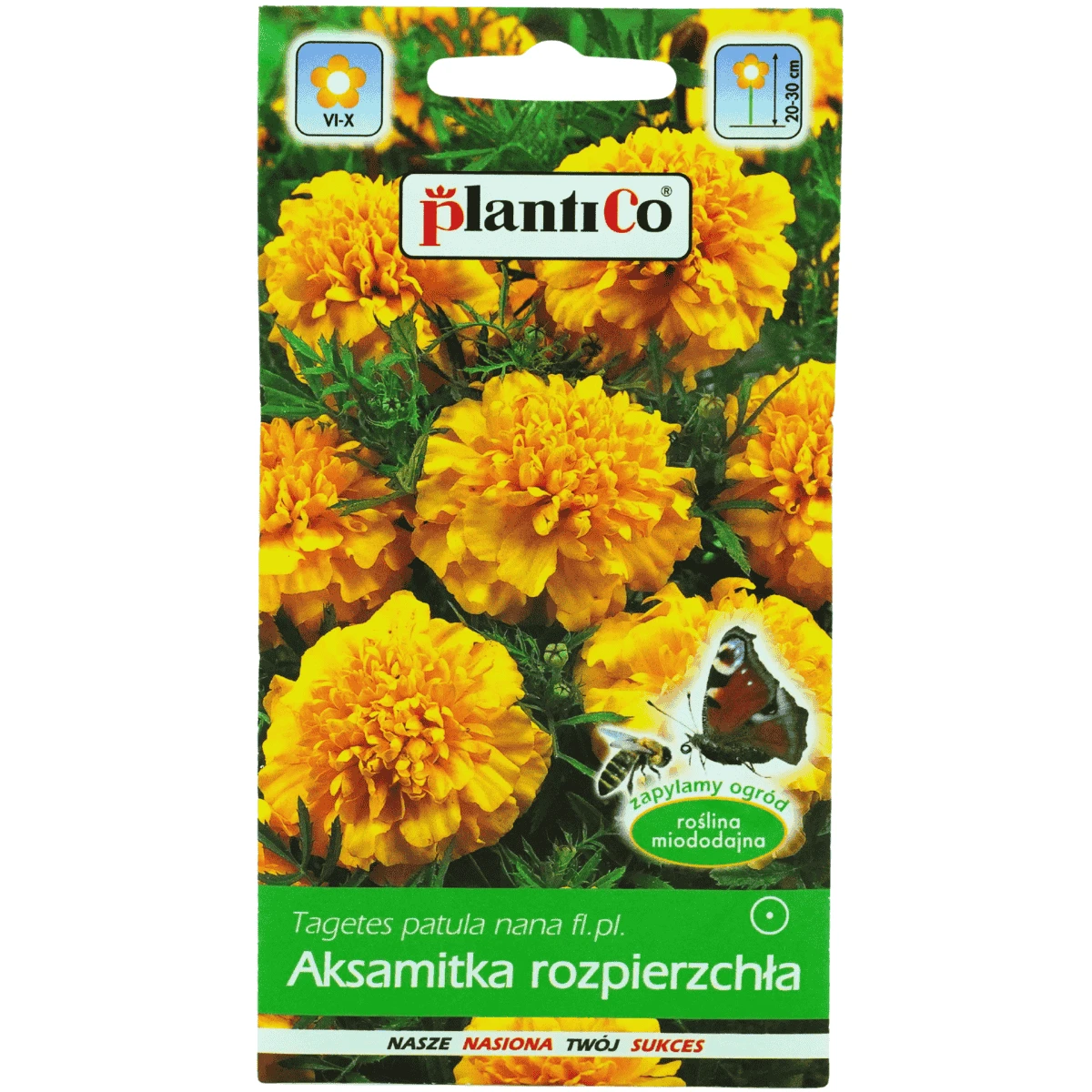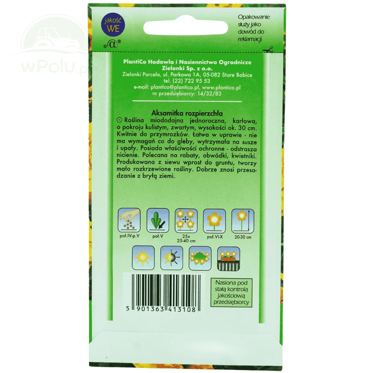 Aksamitka rozpierzchła to jednoroczna roślina ozdobna o zwartym, kulistym pokroju, ceniona za długie i obfite kwitnienie utrzymujące się aż do pierwszych przymrozków. Osiąga wysokość około 20–30 cm, tworząc niskie, estetyczne kępy, które dobrze prezentują się w różnych typach nasadzeń. Roślina jest łatwa w uprawie, odporna na suszę i wysokie temperatury, a jednocześnie ma niewielkie wymagania glebowe – najlepiej rośnie w glebie średnio żyznej, próchnicznej.