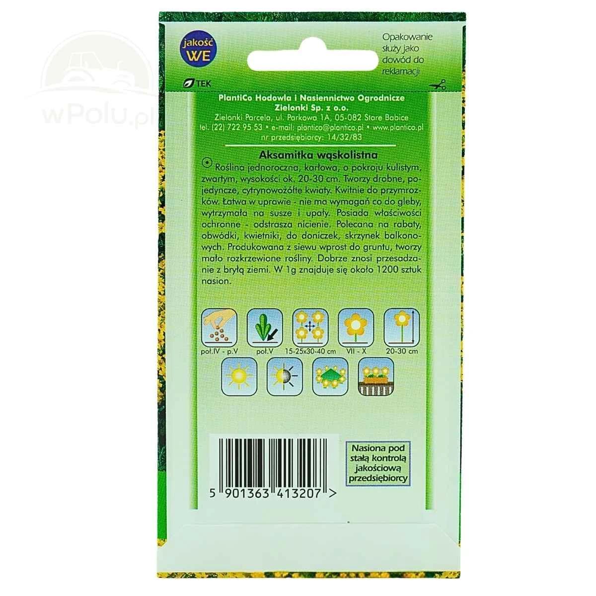 Aksamitka wąskolistna to jednoroczna roślina ozdobna o niskim, zwartym pokroju i drobnych, intensywnie żółtych kwiatach, które tworzą gęste, dekoracyjne kobierce. Odmiana ta wyróżnia się dobrą odpornością na choroby i szkodniki oraz równomiernym wzrostem. Rośliny osiągają wysokość około 20–30 cm i zachowują estetyczny wygląd przez cały okres kwitnienia.
