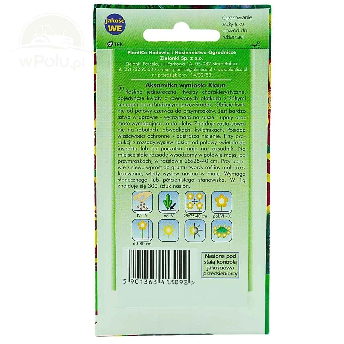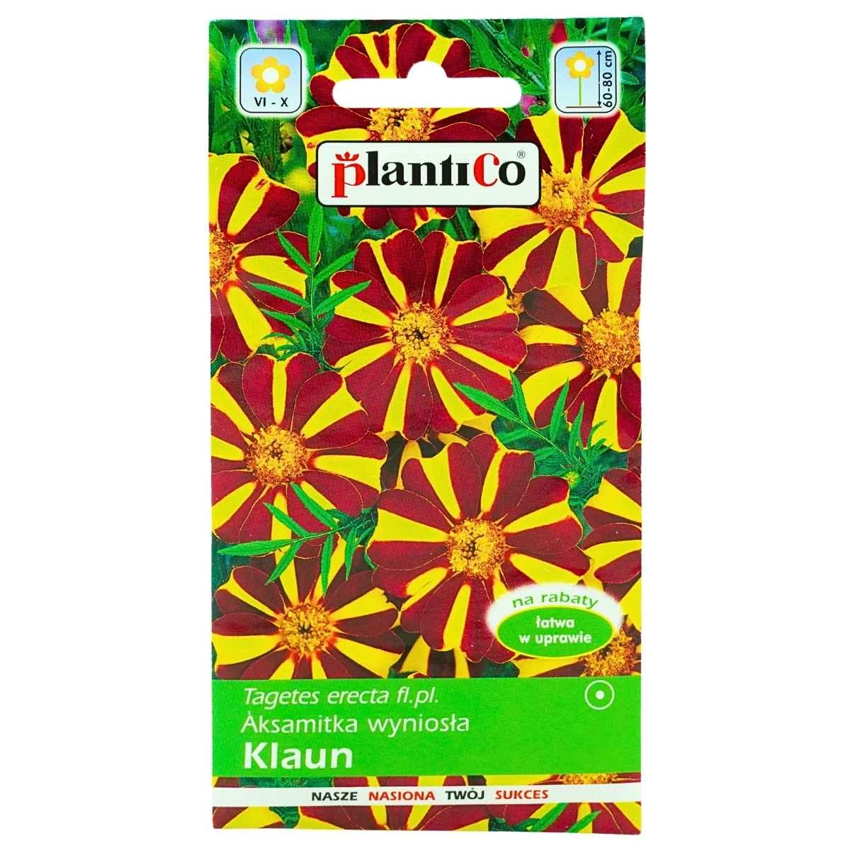 Aksamitka wyniosła Klaun to jednoroczna roślina ozdobna o silnym wzroście i bardzo dekoracyjnych, dwubarwnych kwiatach. Tworzy duże koszyczki kwiatowe o kontrastowym połączeniu intensywnej żółci i głębokiego bordo, widocznym wyraźnie na opakowaniu. Rośliny osiągają wysokość około 60–80 cm i zachowują atrakcyjny wygląd przez cały sezon wegetacyjny. Odmiana ta charakteryzuje się obfitym kwitnieniem utrzymującym się aż do przymrozków oraz zwartym pokrojem, dzięki czemu dobrze prezentuje się w nasadzeniach grupowych.