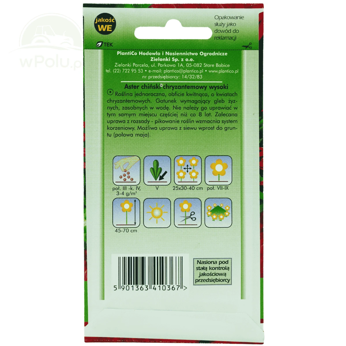 Aster chiński chryzantemowy wysoki to jednoroczna roślina ozdobna o silnym wzroście i bardzo efektownych, pełnych kwiatach przypominających formą chryzantemy. Osiąga wysokość typową dla odmian wysokich, tworząc wzniesione, sztywne pędy zakończone dużymi koszyczkami kwiatowymi. Czerwone kwiaty o gęsto ułożonych, wąskich płatkach nadają roślinie elegancki i wyrazisty wygląd. Odmiana ta wyróżnia się wysoką wartością dekoracyjną oraz uniwersalnym zastosowaniem w nasadzeniach sezonowych.