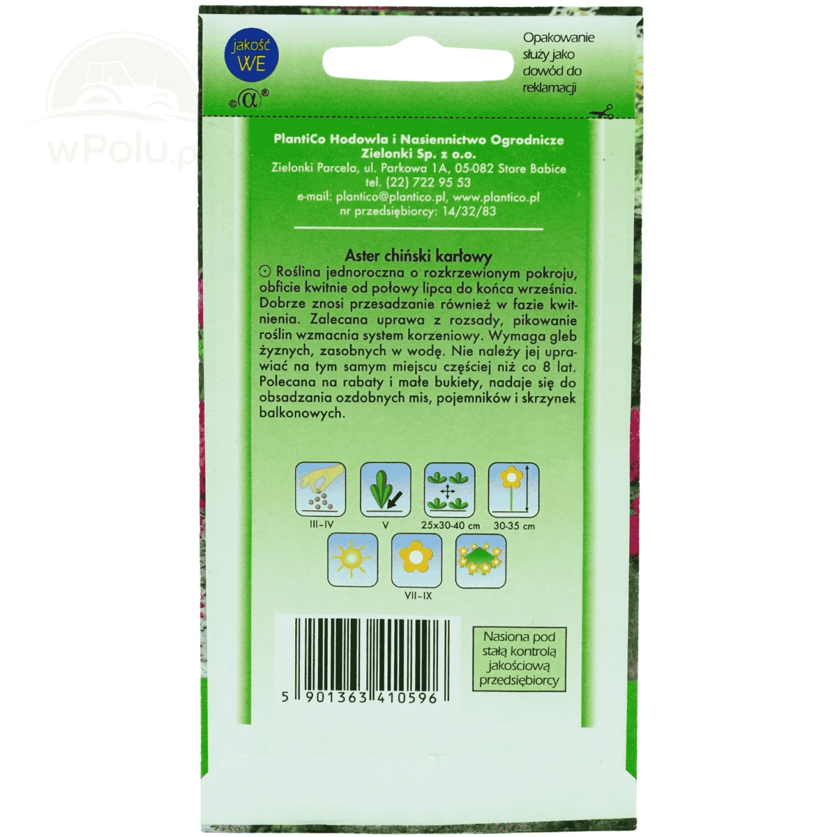 Aster chiński karłowy to jednoroczna roślina ozdobna o zwartym, rozkrzewionym pokroju, przeznaczona do niskich nasadzeń rabatowych oraz uprawy pojemnikowej. Osiąga wysokość około 30–35 cm i obficie kwitnie od połowy lipca do końca września. Tworzy liczne, pełne koszyczki kwiatowe osadzone gęsto nad liśćmi, co zapewnia bardzo dobry efekt dekoracyjny. Roślina posiada intensywnie wybarwione, różowo-czerwone kwiaty, które dobrze sprawdzają się w kompozycjach ogrodowych i balkonowych.