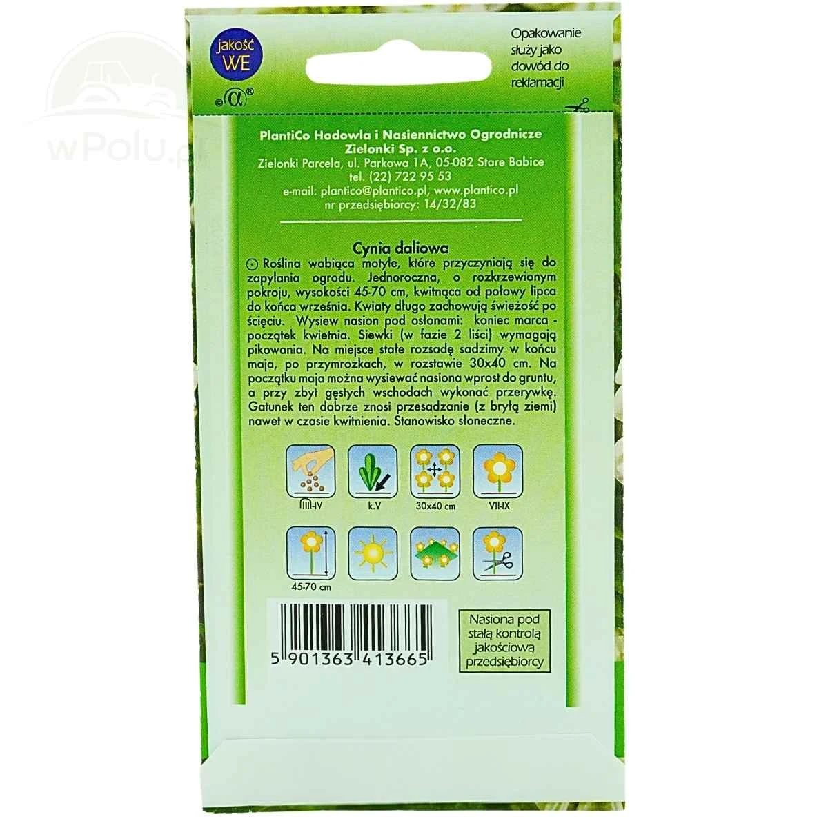 Cynia wytworna daliowa biała to jednoroczna roślina ozdobna o dużych, pełnych kwiatach typu daliowego, wyróżniających się czystą, białą barwą i zwartym pokrojem. Odmiana ta ceniona jest za dekoracyjny wygląd oraz długi okres kwitnienia. Najlepiej rośnie na stanowiskach słonecznych, w glebie żyznej, lekkiej i dostatecznie wilgotnej, o odczynie pH 6,5–7,5. Roślina charakteryzuje się dobrą zdrowotnością oraz równomiernym wzrostem, co czyni ją odpowiednią do różnych form nasadzeń ogrodowych.