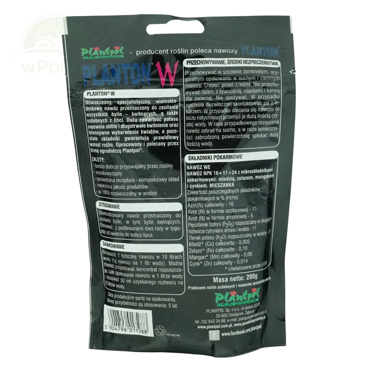 Planton W byliny przeznaczony dla bylin kwitnących i ozdobnych z liści. Jego wysoka zawartość potasu zapewnia obfite i długotrwałe kwitnienie oraz intensywne wybarwienie bylin. Produkt jest w pełni rozpuszczalny w wodzie, łatwo przyswajalny przez rośliny i zawiera sprawdzoną recepturę z kompleksowym składem, w tym NPK 16+11+24 oraz mikroskładniki pokarmowe.