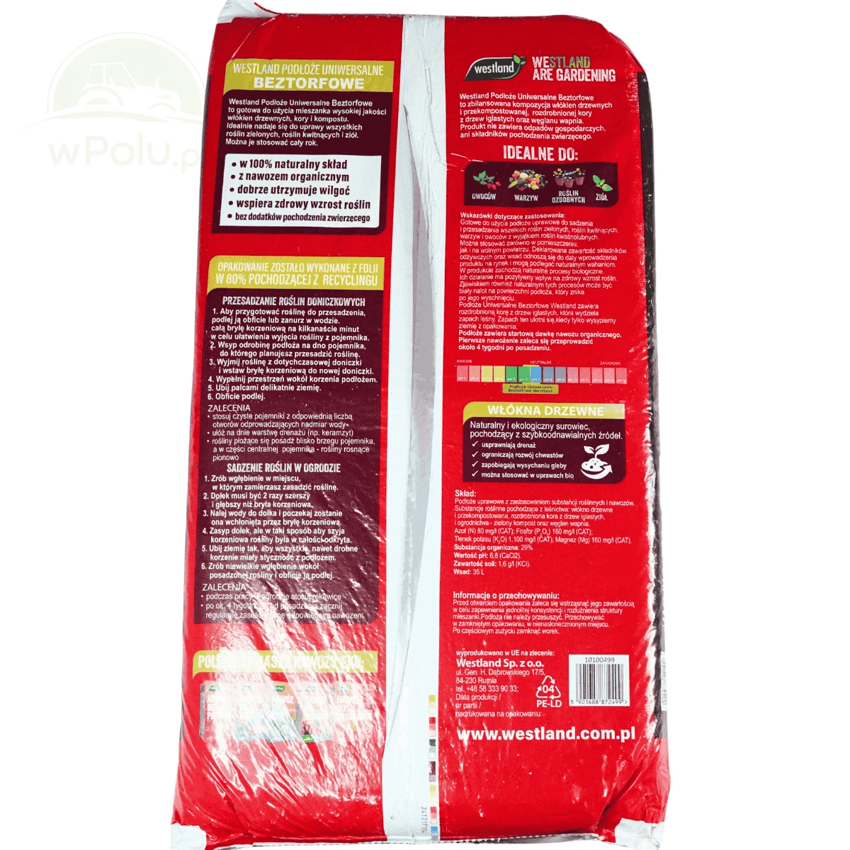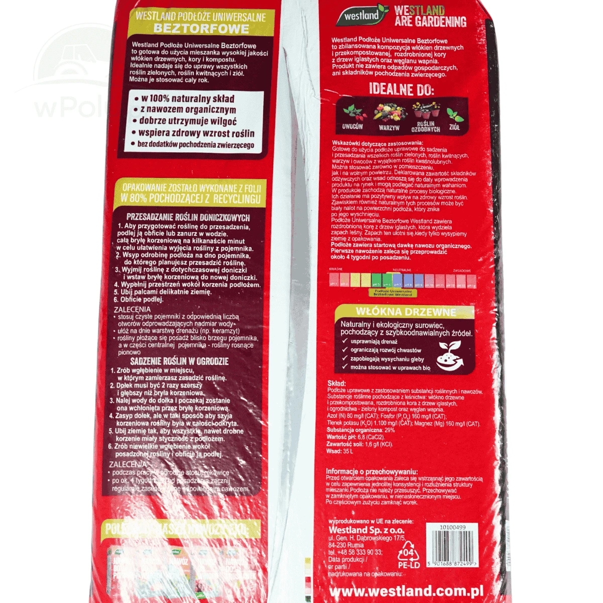 Gotowe podłoże uprawowe idealne dla roślin zielonych, kwitnących, warzyw i owoców, poza kwaśnolubnymi. Może być używane wewnątrz i na zewnątrz. Zawiera składniki odżywcze i naturalne procesy biologiczne wspierające wzrost roślin. Biały nalot na podłożu, który znika po wyschnięciu, jest zjawiskiem naturalnym. Podłoże Beztorfowe Westland z drobno zmieloną korą drzew iglastych wydziela leśny aromat, który ulatnia się po rozpakowaniu. Zaleca się pierwsze nawożenie około 4 tygodnie po zasadzeniu.