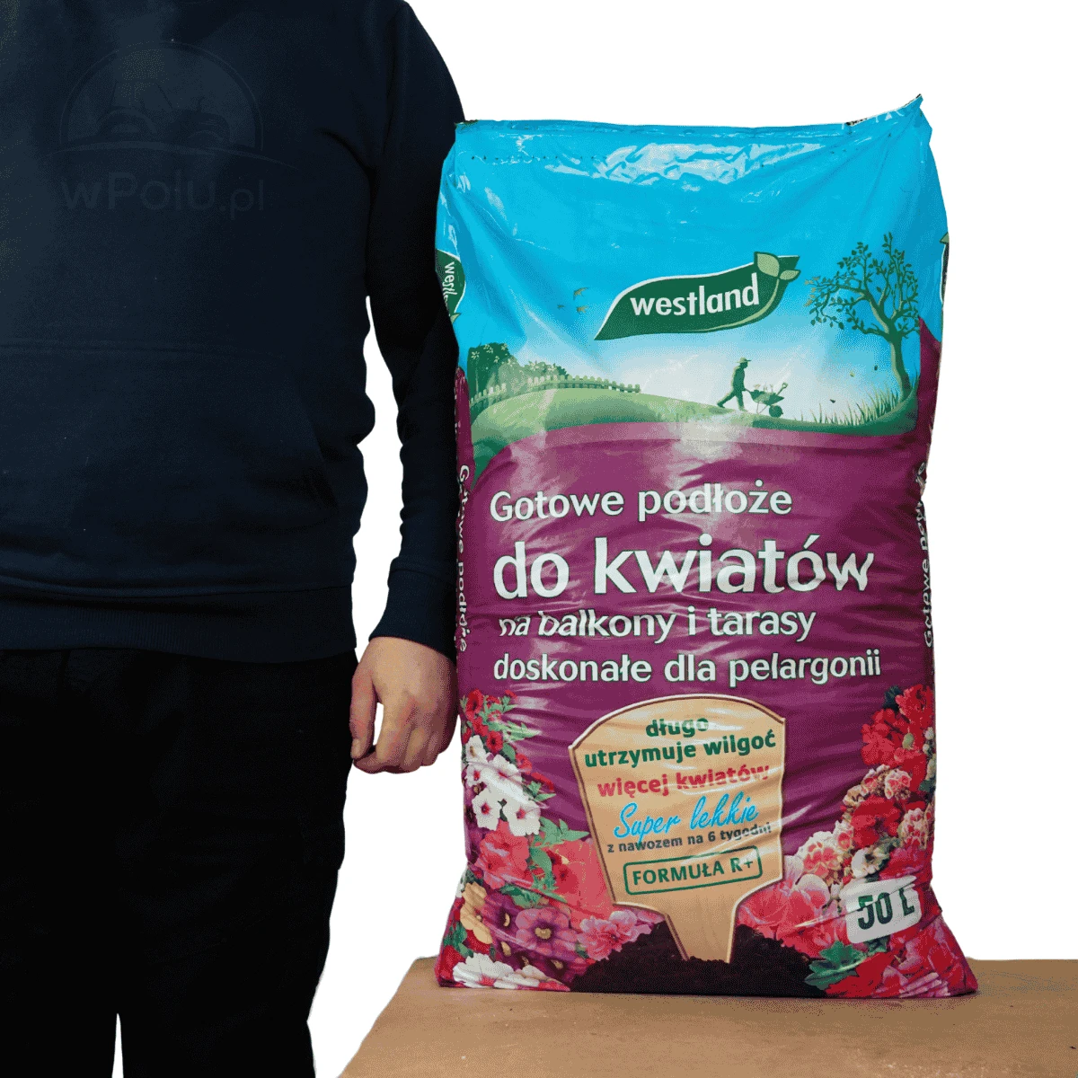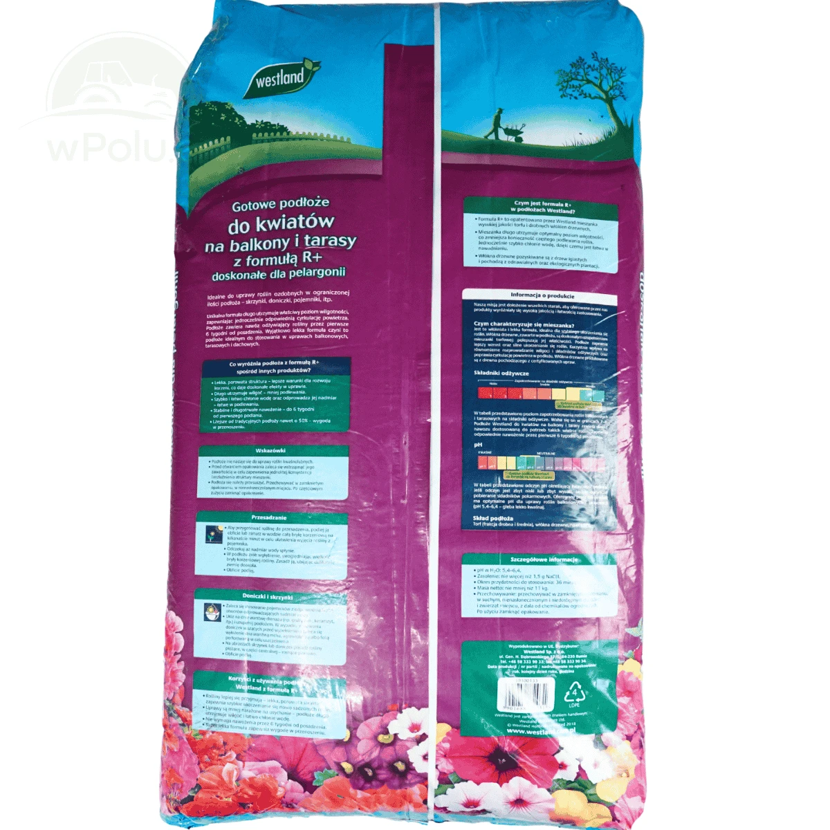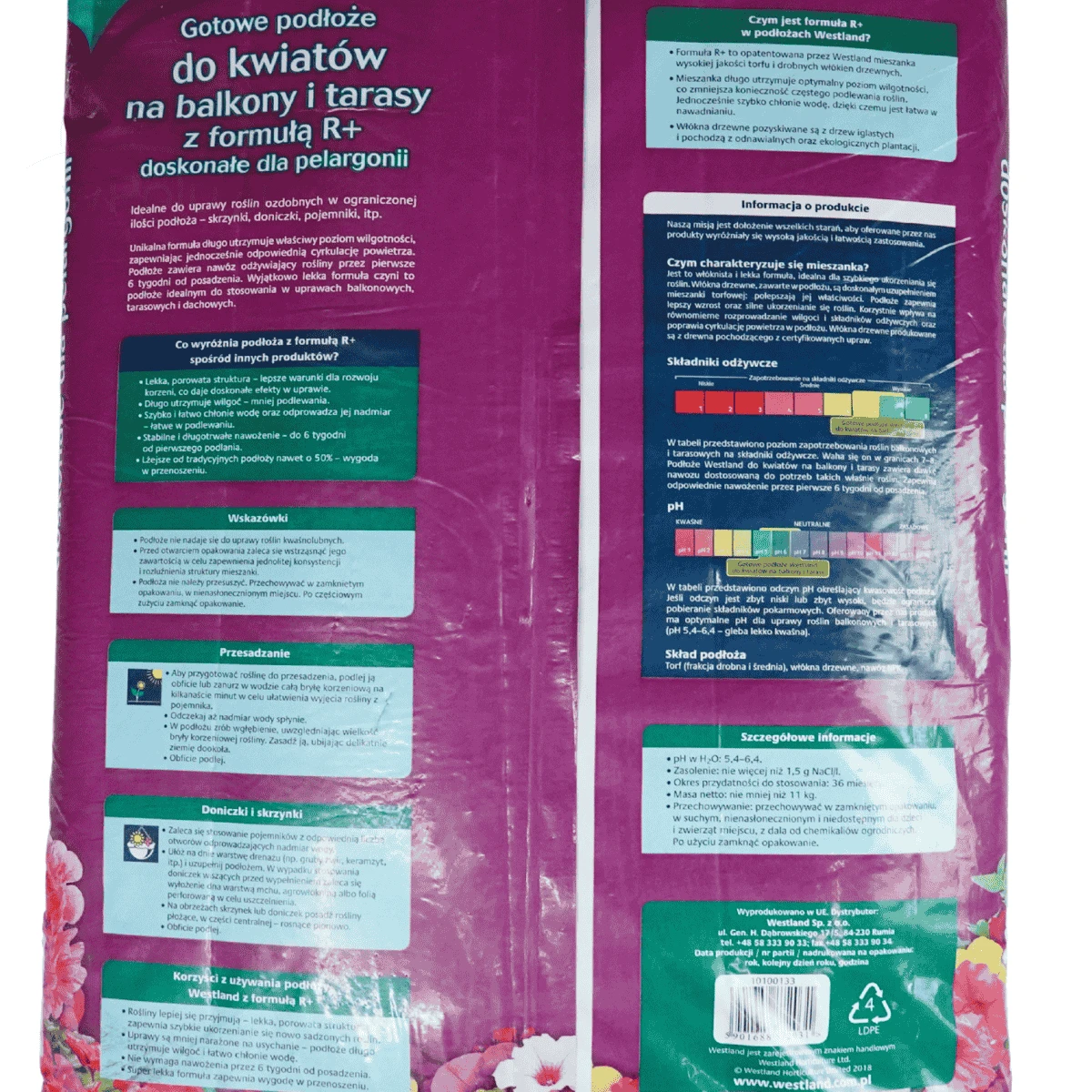 Gotowe podłoże do kwiatów na balkony i tarasy z formułą R+ doskonałe do pelargonii 20L firmy Westland jest produktem przeznaczonym do uprawy roślin ozdobnych w ograniczonej ilości podłoża -skrzynki, doniczki, pojemniki. Jest to mieszanka specjalnie dobrana do potrzeb roślin ozdobnych, które często są narażone na trudne warunki atmosferyczne, takie jak intensywne nasłonecznienie czy zmienne temperatury. Unikalna formuła dlugo utrzymuje właściwy poziom wilgotności, zapewniając odpowiednia cyrkulację powietrza. Zawiera nawóz odżywiający rośliny, który działa przez pierwsze 6 tygodni od posadzenia. Podłoże nie nadaje się do uprawy roślin kwaśnolubnych.Ma optymalne PH 5,4-6,4. Lekka, porowata struktura zapewnia szybkie ukorzenianie się nowo sadzonych roślin i łatwo chłonie wodę. Formuła R+ to opatentowana przez Westland mieszanka wysokiej jakości torfu i drobnych włókien drzewnych.Włókna drzewne pozyskiwane są z drzew iglastych i pochodzą z odnawialnych oraz ekologicznych plantacji.Lżejsze od tradycyjnych podłoży nawet o 50%