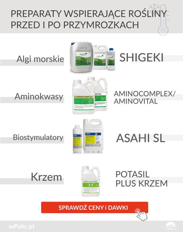 Jak należy chronić rośliny przed przymrozkami, ale i wpływem niekorzystnych warunków termicznych? Najbardziej popularną metodą jest przykrywanie truskawki białą agrowłókniną (minimum P-23 lub grubszą). Agrowłókninę nakładamy na plantację truskawek, gdy temperatura jest jeszcze dodatnia i zdejmujemy, gdy wartość temperatury również będzie na plusie. Pod agrowłókniną panują inne warunki niż na zewnątrz, z reguły temperatura jest wyższa o kilka stopni. W przypadku drzew i krzewów popularna jest ochrona poprzez zraszanie wodą z zastosowaniem instalacji takich jak zraszacze nadkoronowe. Dodatkowym zabezpieczeniem jest przygotowanie roślin od strony fizjologicznej, poprzez odpowiednie zabiegi nawożenia. Rośliny przede wszystkim nie mogą być osłabione chorobami i żerowaniem szkodników. W okresie pojawiających się przymrozków nie należy intensywnie nawozić roślin azotem, wyjątkiem są niewielkiej dawki mocznika (0,5%). Ważnym pierwiastkiem w budowaniu odporności roślin uprawnych na niekorzystne warunki temperaturowe jest krzem. Buduje on cienką warstwę krzemionki w tkankach okrywających. Z kolei cynk poprawia odporność rośliny na niskie temperatury. Wśród makroelementów bardzo ważne są: wapń i fosfor, które odpowiadają za podziały komórkowe, oraz potas. Istotne jest, aby wszystkie wymienione składniki podać roślinom na 2-3 dni przed spadkiem temperatury. Potrzebują one czasu, aby zostać prawidłowo pobrane i zasymilowany w tkankach roślinnych. Wyjątkiem jest krzem, można go zastosować bezpośrednio przed przymrozkami np. Potasil Plus Krzem w dawce 2,5 l/ha. Budowanie fizjologicznej odporności roślin jest ważnym elementem strategii ochrony przed przymrozkami i stymulacji po przymrozkach. W ramach tej strategii doskonale sprawdzają się również produkty oparte na aminokwasach oraz algach morskich. Może to być Aminocomplex (2 l na ha) zawierający 24% wolnych aminokwasów i mikroelementy. Preparaty zawierające specjalnie przygotowane wyciągi z alg morskich to na przykład Maxi Grow lub Shigeki. Innym preparatem wspierających rośliny w czasie niekorzystnych warunków jest Asahi SL. Co ważne, należy zwrócić uwagę, aby w okresie stresowym, zwłaszcza niskich temperatur, nadmiernie nie obciążać blaszki liściowej stosowanymi nawozami, szczególnie mineralnymi. Korzystniejsze będzie zapewnienie odpowiedniego żywienie doglebowo, za pomocą fertygacji. Stosowanie nawozów mineralnych np. FERTYGOLD poprzez system kropelkowy można wspierać biostymulacją systemu korzeniowego preparatami HUMIK i AMINOVITAL. Będzie to wsparcie dla wspomnianej strategii zwiększania naturalnej fizjologicznej odporności roślin.