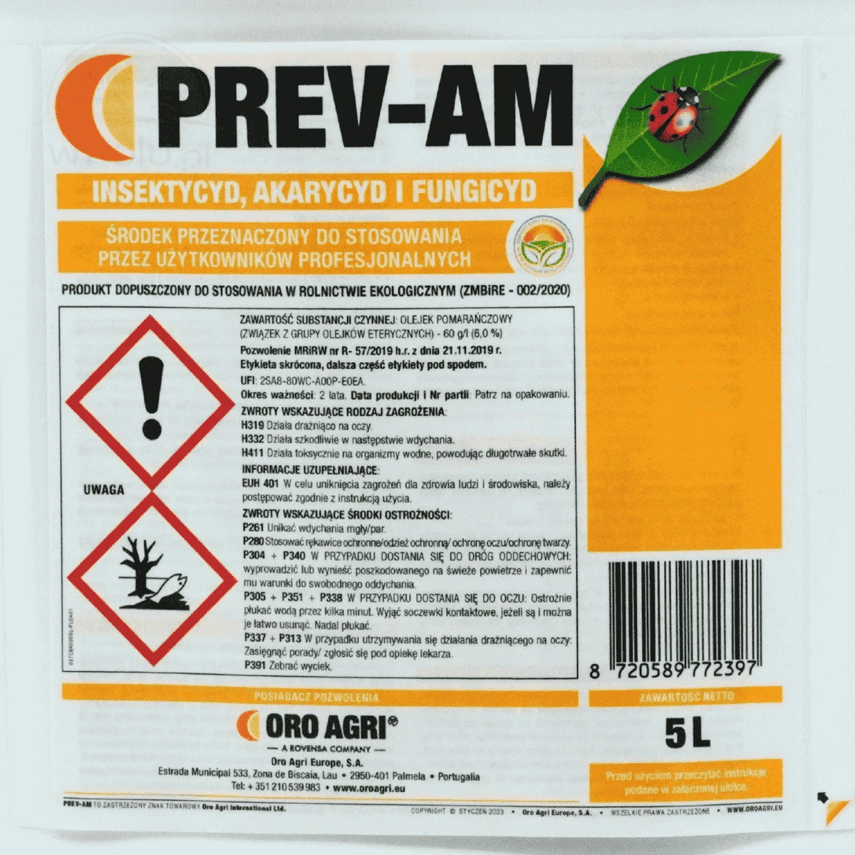 Dzięki właściwościom lipofilowym olejek pomarańczowy ma zdolność przenikania i niszczenia zewnętrznych warstw ochronnych owadów i grzybni, powodując wysoką śmiertelność u szkodników i znaczne zmniejszenie presji ze strony patogenów. PREV-AM wysusza oskórki owadów o miękkich ciałach oraz ściany komórkowe (lub warstwę fosfolipidową) patogenów grzybowych, np. mączniaka prawdziwego.