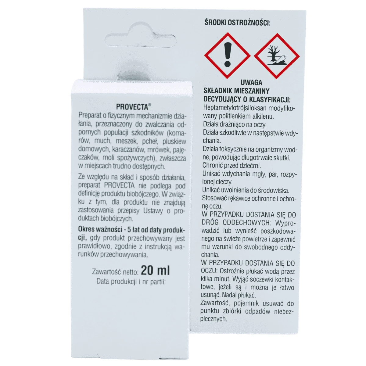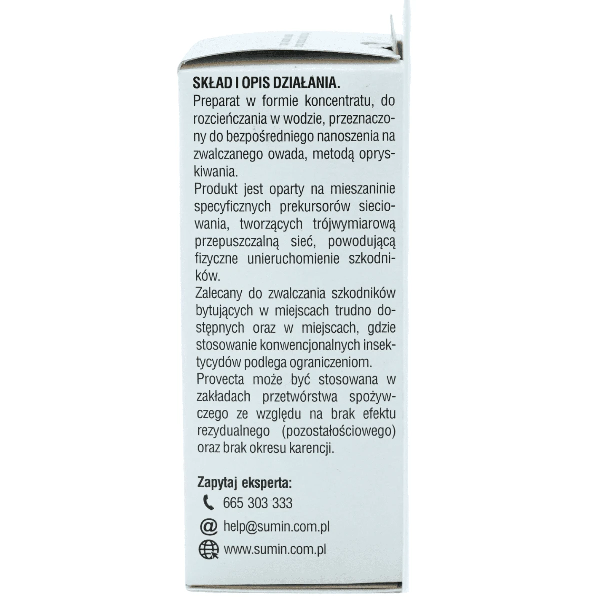 ProVecta® to innowacyjny preparat owadobójczy, działający w sposób całkowicie fizyczny, bez udziału tradycyjnych substancji chemicznych. Po aplikacji tworzy trójwymiarową, przepuszczalną sieć, która unieruchamia owady, skutecznie eliminując je z otoczenia. Preparat przeznaczony jest do bezpośredniego opryskiwania powierzchni i miejsc występowania szkodników. Jego nietoksyczna i bezpieczna formuła nie zawiera pestycydów ani związków chemicznych o działaniu biobójczym. ProVecta® jest bezwonna, nie pozostawia plam i występuje w formie koncentratu do rozcieńczania w wodzie, co zapewnia łatwe i wygodne stosowanie.