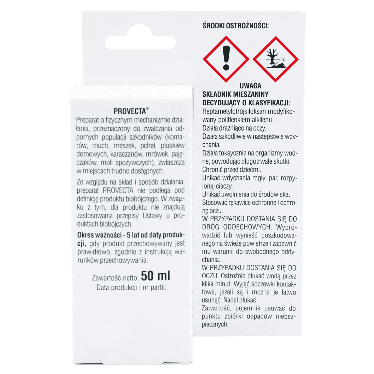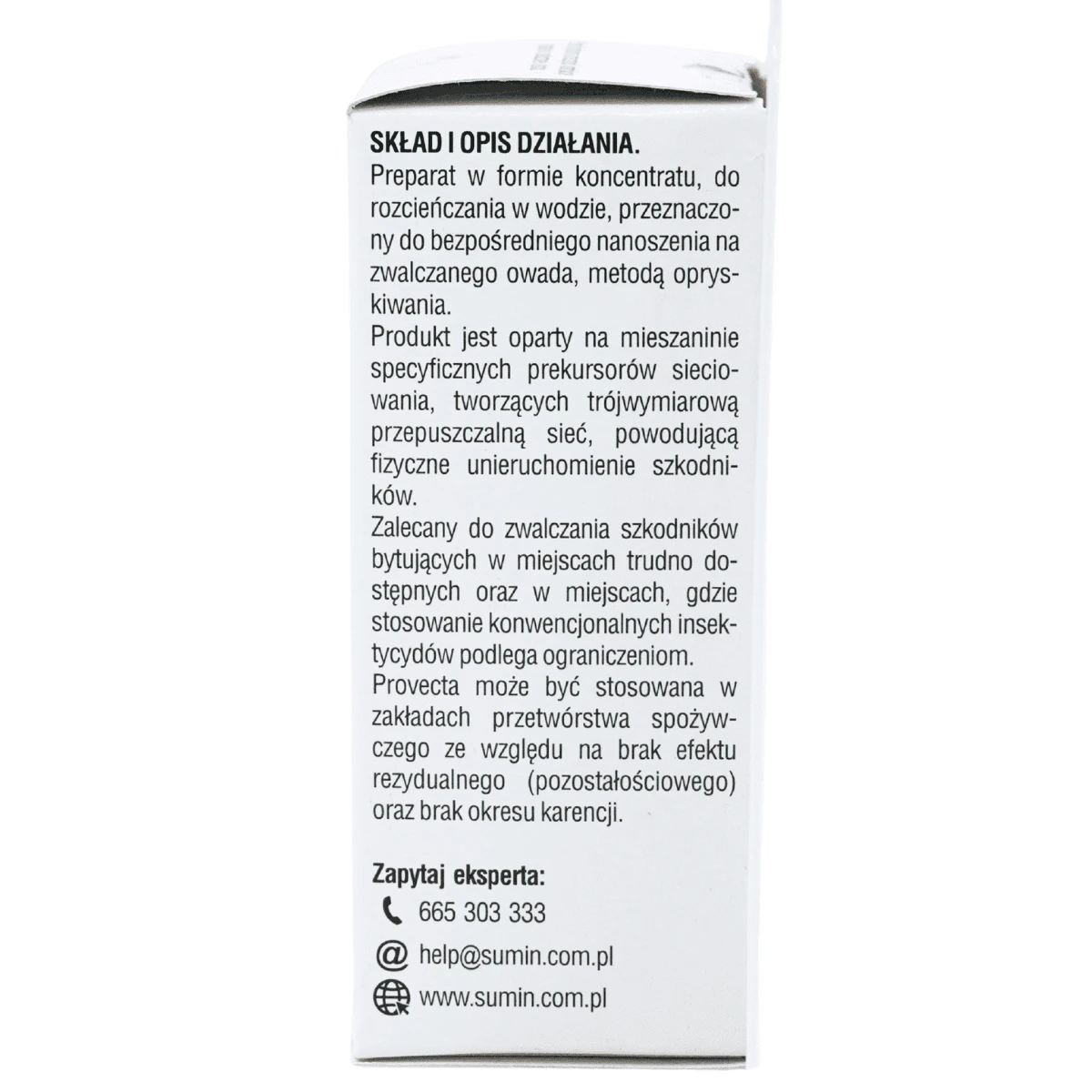 ProVecta® to nowoczesny preparat owadobójczy o fizycznym mechanizmie działania, który skutecznie eliminuje szkodniki bez użycia tradycyjnej chemii. Działa poprzez tworzenie trójwymiarowej, przepuszczalnej sieci, unieruchamiającej owady. Produkt przeznaczony jest do bezpośredniego nanoszenia metodą opryskiwania, a jego formuła oparta jest na bezpiecznych składnikach pozbawionych działania toksycznego. Preparat nie zawiera pestycydów chemicznych ani substancji toksycznych - jego działanie jest wyłącznie fizyczne. Produkt jest nietoksyczny, bezwonny i nie pozostawia plam na powierzchniach, w formie koncentratu do rozcieńczania w wodzie.
