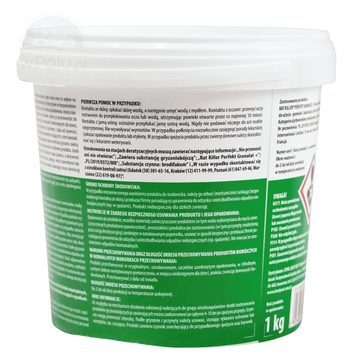 Rat Killer® Perfekt Granulat to gotowa do użycia, granulowana przynęta rodentycydowa do skutecznego zwalczania myszy domowej (Mus musculus) i szczura wędrownego (Rattus norvegicus). Forma granulatu zapewnia wysoką atrakcyjność pokarmową oraz wygodną i precyzyjną aplikację w stacjach deratyzacyjnych.