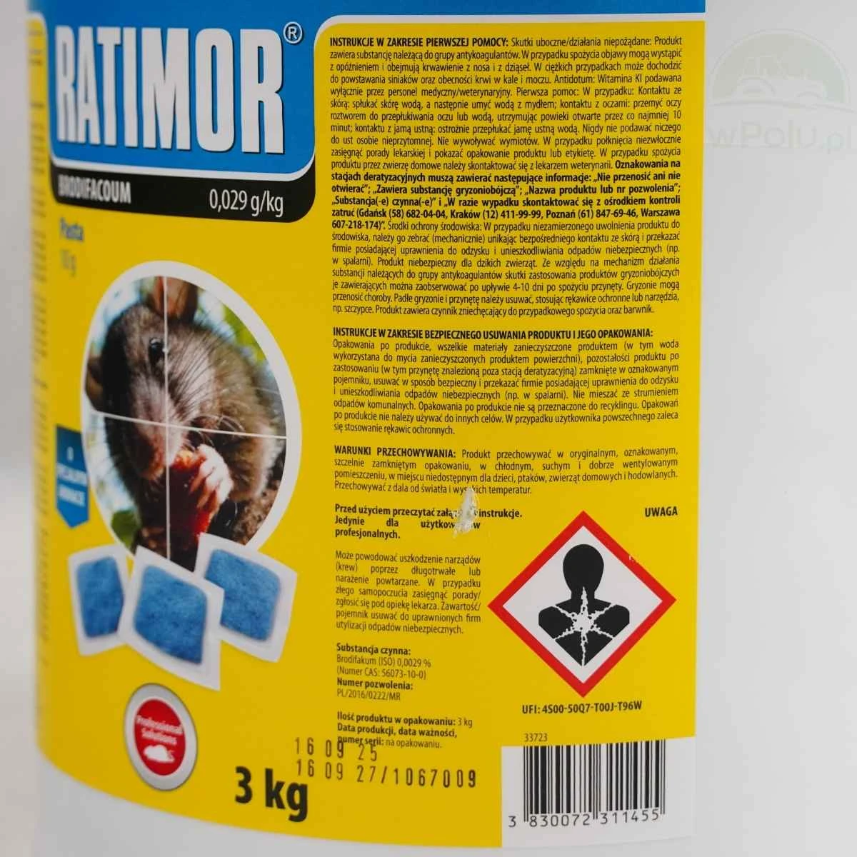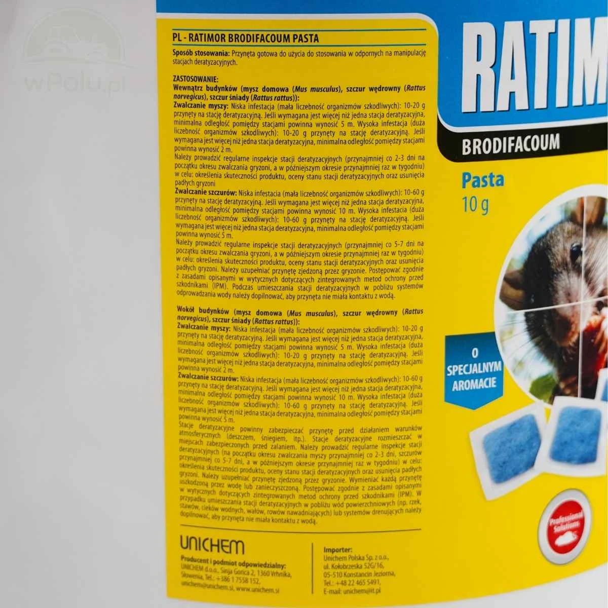 Ratimor Brodifacoum 29 ppm Pasta to profesjonalny preparat gryzoniobójczy w postaci gotowej do użycia pasty, umieszczonej w poręcznych saszetkach. Środek przeznaczony jest do zwalczania szczura wędrownego oraz myszy domowej w obiektach oraz w ich bezpośrednim otoczeniu. Zawarte w formulacji brodifakum cechuje się bardzo wysoką skutecznością, dzięki czemu przynęta działa efektywnie nawet przy niewielkim jej pobraniu. Produkt przeznaczony jest wyłącznie dla użytkowników profesjonalnych i powinien być stosowany zgodnie z zasadami bezpieczeństwa oraz obowiązującymi regulacjami dotyczącymi środków biobójczych.