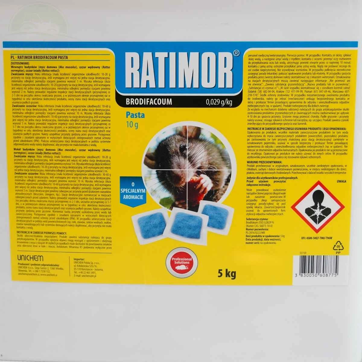 Ratimor Brodifacoum 29 ppm pasta to profesjonalna trutka na myszy i szczury w formie gotowej do użycia pasty pakowanej w wygodne saszetki. Preparat przeznaczony jest do skutecznego zwalczania szczura wędrownego oraz myszy domowej wewnątrz i wokół budynków. Dzięki wyjątkowo wysokiej skuteczności substancji czynnej brodifakum środek zapewnia kontrolę populacji gryzoni nawet przy niskim pobraniu przynęty. Produkt jest przeznaczony do użytku profesjonalnego, zgodnie z obowiązującymi zasadami bezpieczeństwa oraz regulacjami dotyczącymi biobójczych środków deratyzacyjnych.