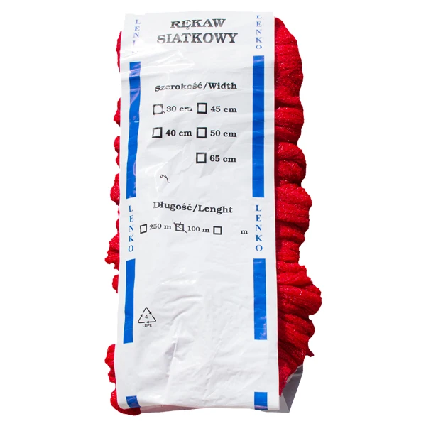 Rękaw dziany o diamentowym splocie polskiego producenta Lenko przeznaczony jest do automatycznego pakowania owoców i warzyw oraz innych produktów. Rękawy dziane oferowane są w szerokiej gamie kolorów o różnych szerokościach.