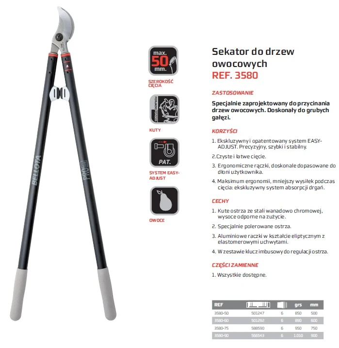 Sekator dwuręczny Bellota 3580-75 to solidne i precyzyjne narzędzie ogrodnicze, stworzone z myślą o przycinaniu drzew owocowych oraz grubych gałęzi. Wyposażony w kute ostrza ze stali wanadowo-chromowej, zapewnia czyste i szybkie cięcie, a ich specjalne polerowanie dodatkowo zwiększa trwałość i odporność na zużycie. Długie, aluminiowe rączki w kształcie eliptycznym, zakończone ergonomicznymi uchwytami z elastomeru, gwarantują pewny chwyt i komfort podczas pracy.