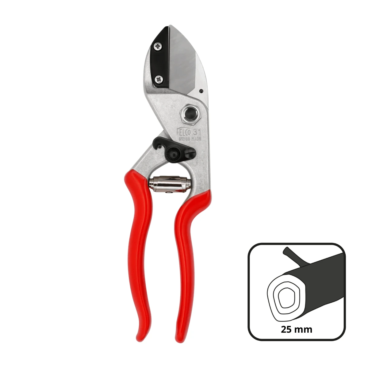 Felco 31 to profesjonalny sekator kowadełkowy zaprojektowany do efektywnego przycinania nawet zdrewniałych i suchych gałęzi. Wyposażony w wyjątkowo ostre, proste ostrze tnące ze stali, które działa dwustronnie, gwarantuje czyste i precyzyjne cięcia. Ergonomiczna konstrukcja oraz wysoka jakość wykonania sprawiają, że narzędzie jest komfortowe w użytkowaniu i zapewnia dużą wydajność podczas pracy. Sekator przeznaczony jest zarówno dla osób prawo-, jak i leworęcznych, co czyni go uniwersalnym rozwiązaniem w ogrodzie i sadzie.