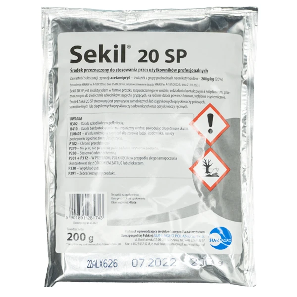 Sekil 20 SP jest insektycydem w formie proszku rozpuszczalnego w wodzie, na roślinie działa powierzchniowo, wgłębnie i systemicznie. Zwalcza szkodniki ssące i gryzące, działając na nie kontaktowo i żołądkowo. Środek Sekil 20 SP stosuje się przy użyciu samobieżnych lub ciągnikowych opryskiwaczy polowych, samobieżnych lub ciągnikowych opryskiwaczy sadowniczych, opryskiwaczy ręcznych oraz aparatury agrolotniczej.