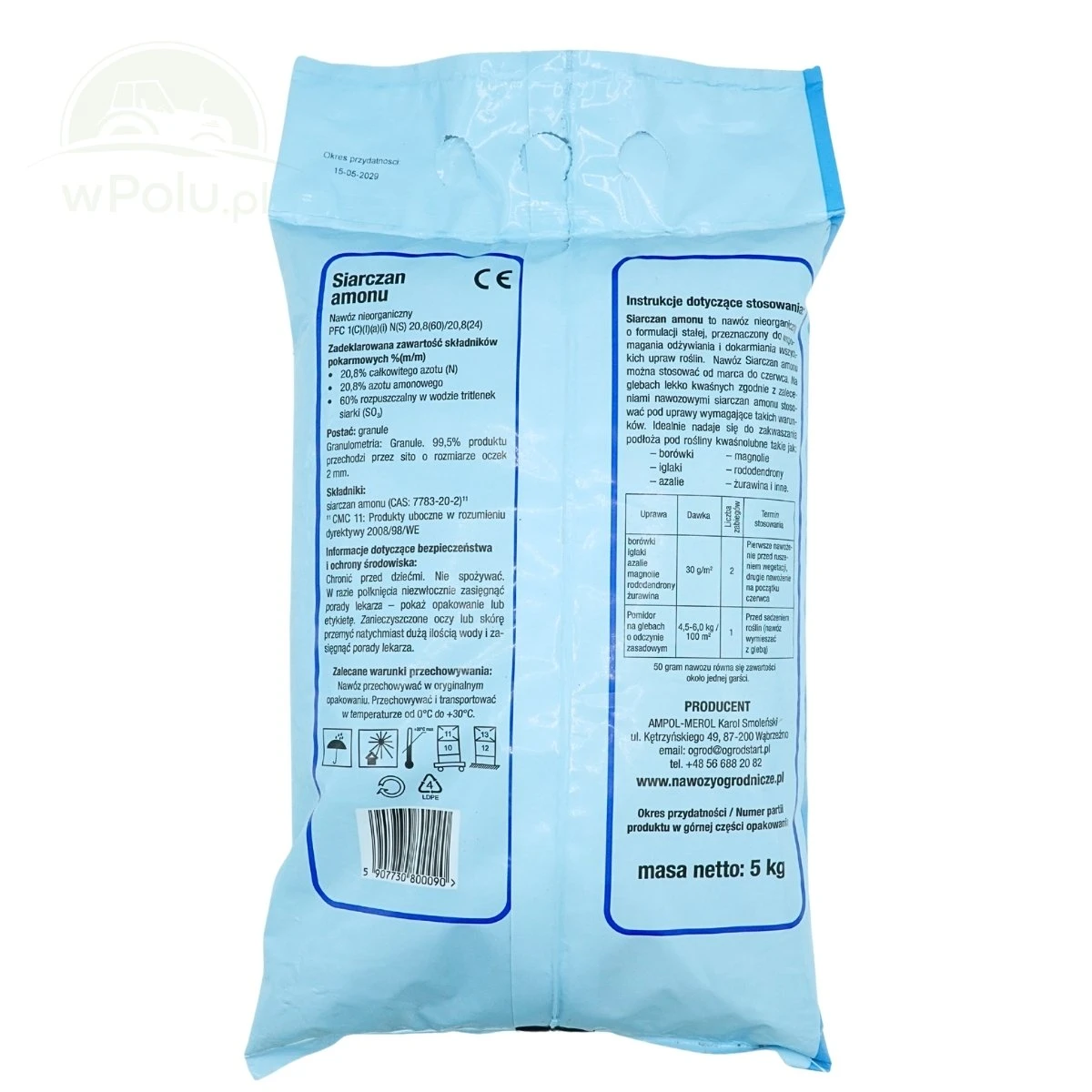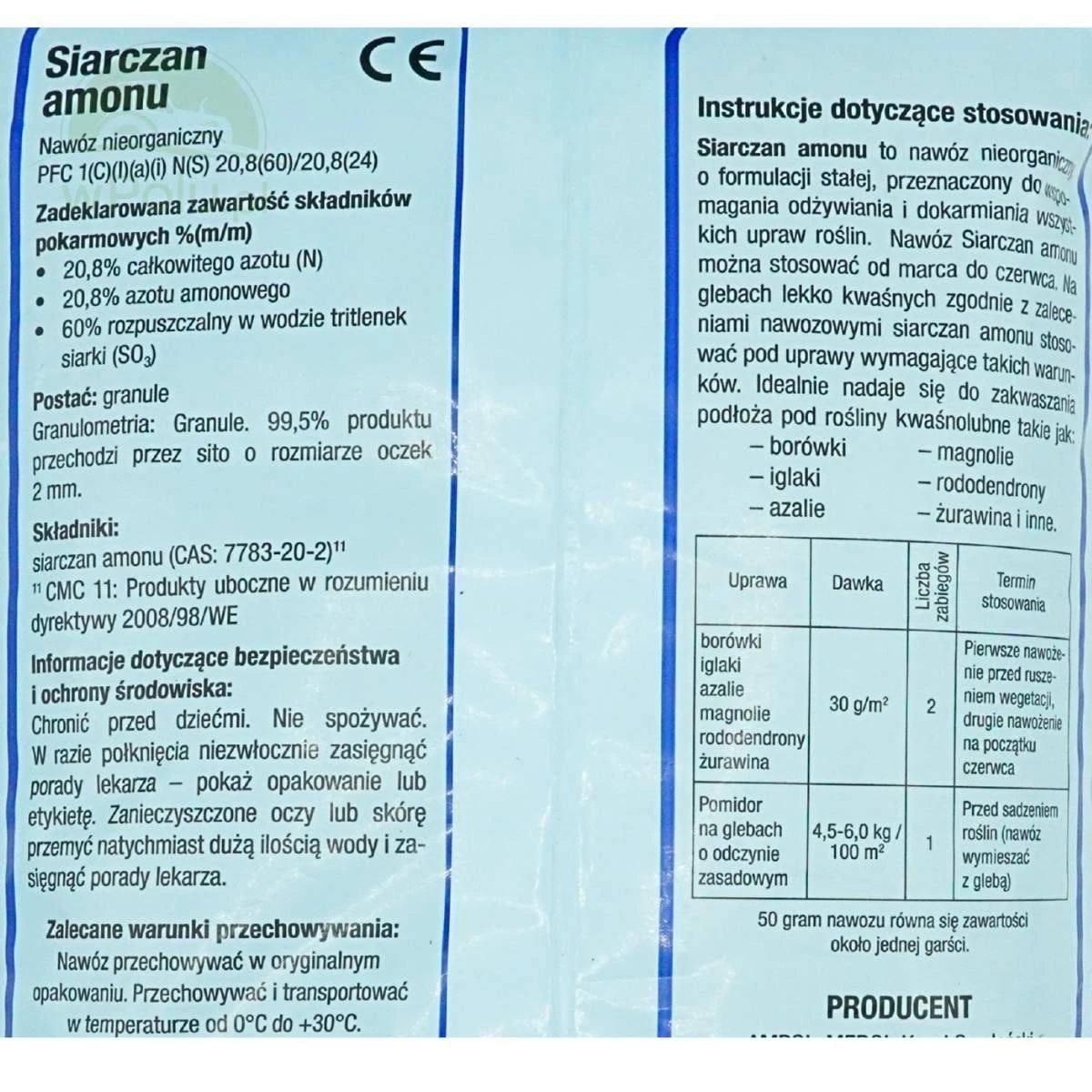 Uniwersalny nawóz krystaliczny przeznaczony do zakwaszania gleby. Zawiera azot w formie amonowej oraz łatwo dostępną siarkę. Uzupełnia niedobory azotu i siarki, które najczęściej występują w fazie intensywnego wzrostu roślin, co znacząco wpływa na jakość i wysokość plonów. Siarczan Amonu należy stosować przedsiewnie, przede wszystkim na glebach o odczynie zasadowym lub obojętnym. Na glebach lekko kwaśnych nawóz stosuje się zgodnie z zaleceniami nawozowymi do konkretnych upraw. Ponadto siarczan amonu można stosować jako dodatek wspomagający działanie środków chwastobójczych.