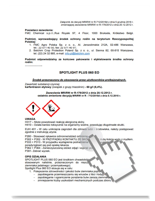Pełne stosowanie znajdziesz w etykiecie środka ochrony roślin Spotlight Plus 060 EO poniżej.