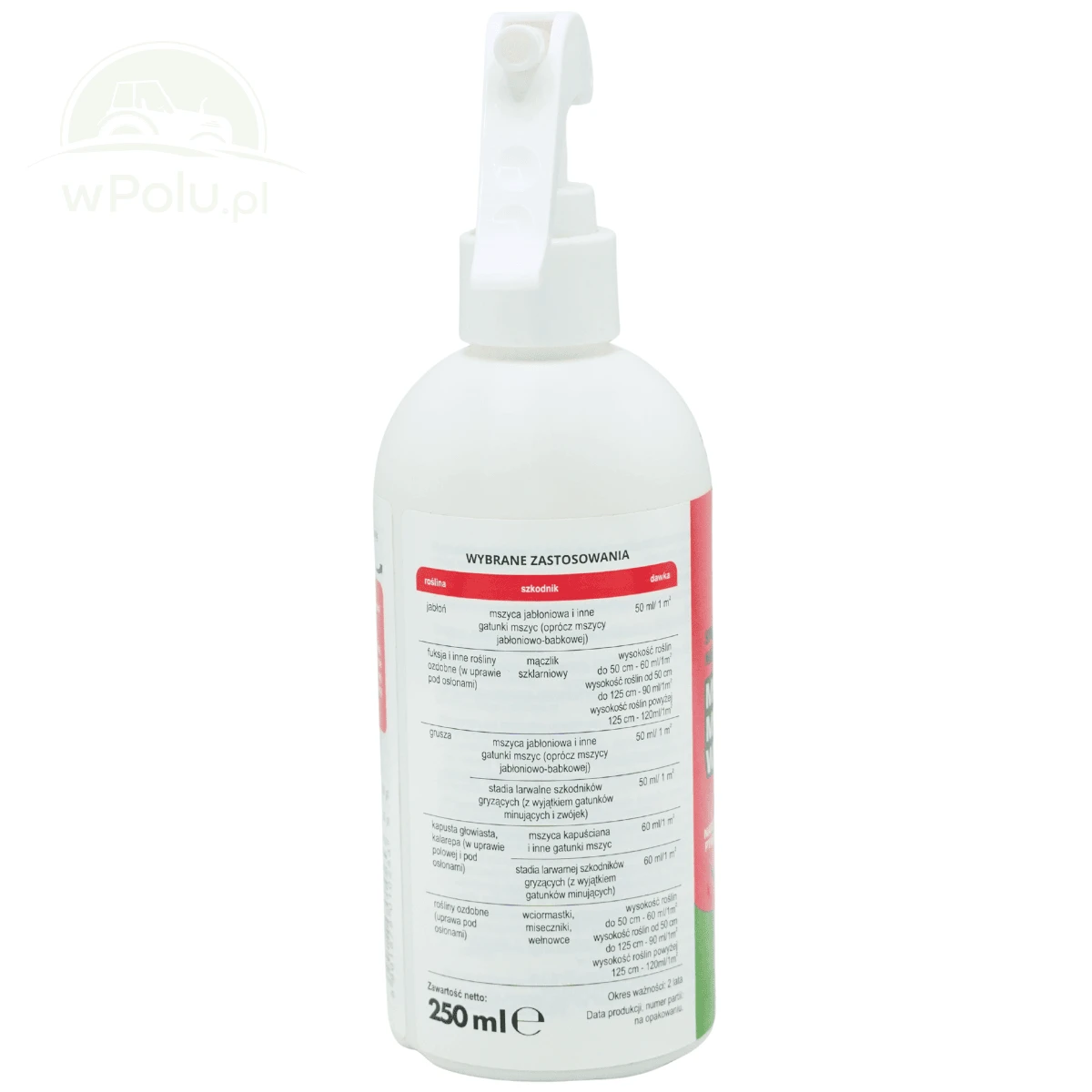 Środek zawiera dwie substancje czynne: pyretryny- substancja pochodzenia roślinnego, początkowo działająca paraliżująco, a następnie szkodniki giną. Olej rzepakowy - który działa fizycznie, na powierzchni ciała szkodnika tworzy film powodujący uduszenie się owadów i roztoczy.