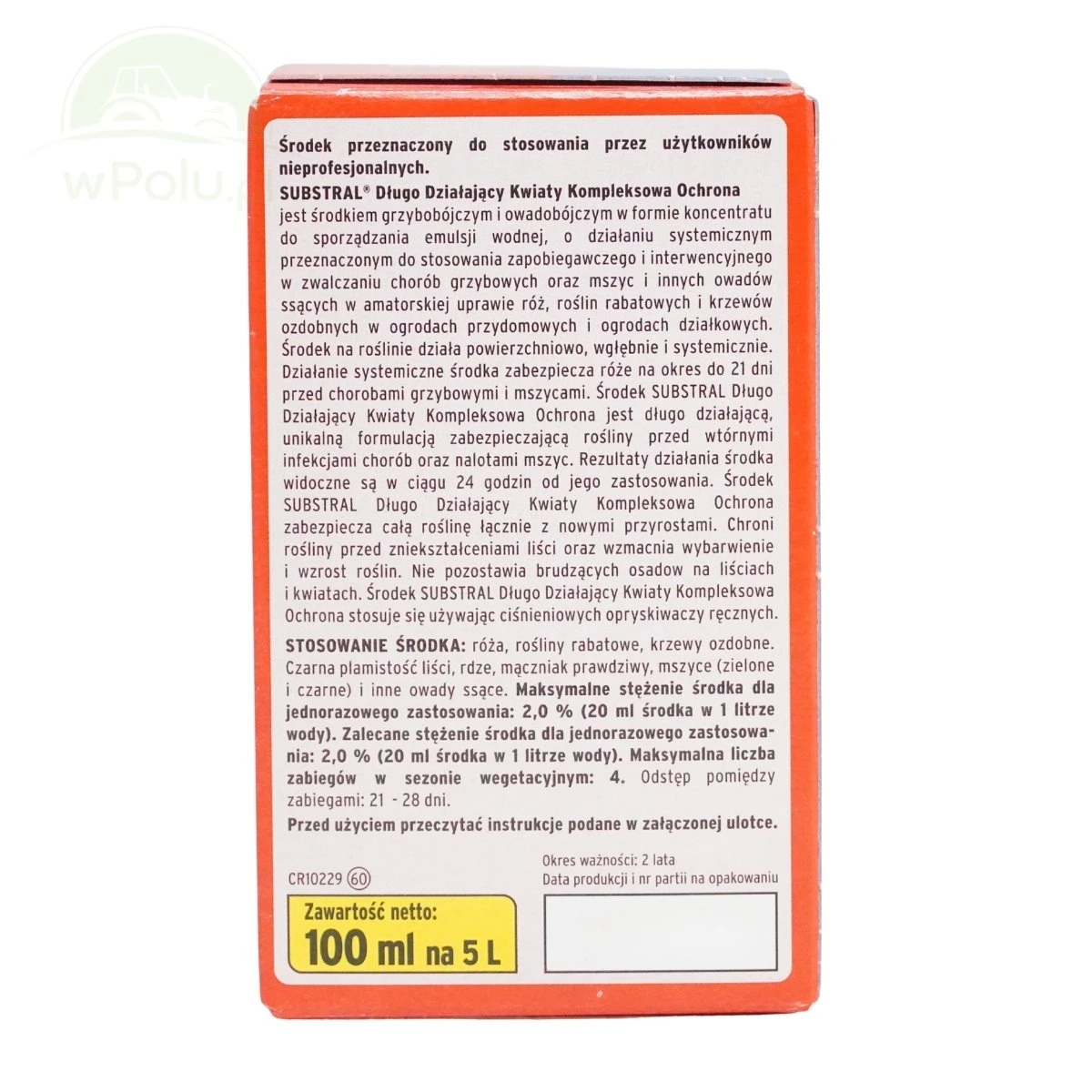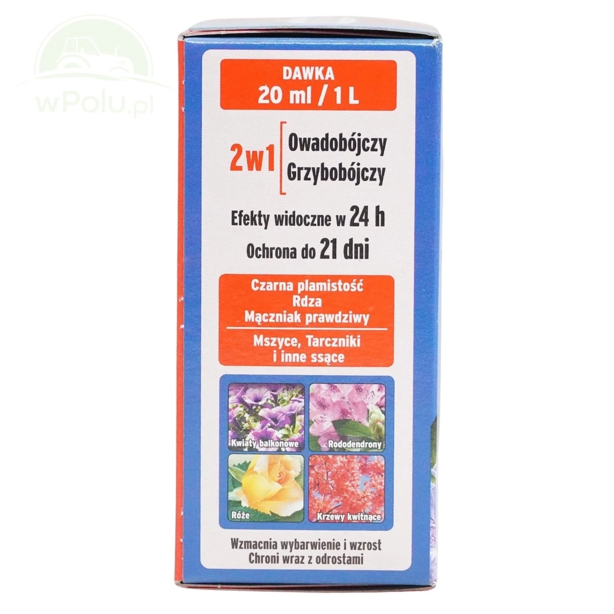 Kwiaty Kompleksowa Ochrona 2w1 to insektycyd i fungicyd. Skutecznie zwalcza choroby grzybowe i owady, w tym mszyce, w uprawach roślin ozdobnych, takich jak róże, kwitnące krzewy i rododendrony. Preparat działa na różnych poziomach – powierzchniowo, wgłębnie i systemicznie, zapewniając kompleksową ochronę roślin. Szybko wchłaniany przez rośliny, nie pozostawia osadów i wykazuje działanie w ciągu 24 godzin. Zapewnia trwałą ochronę, szczególnie efektywną w przypadku róży przez 21 dni, i pozytywnie wpływa na wygląd roślin.