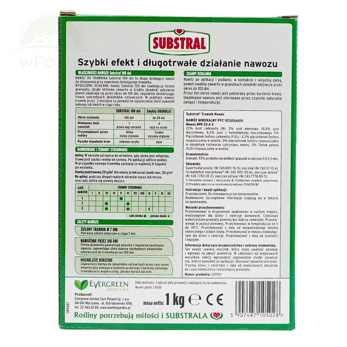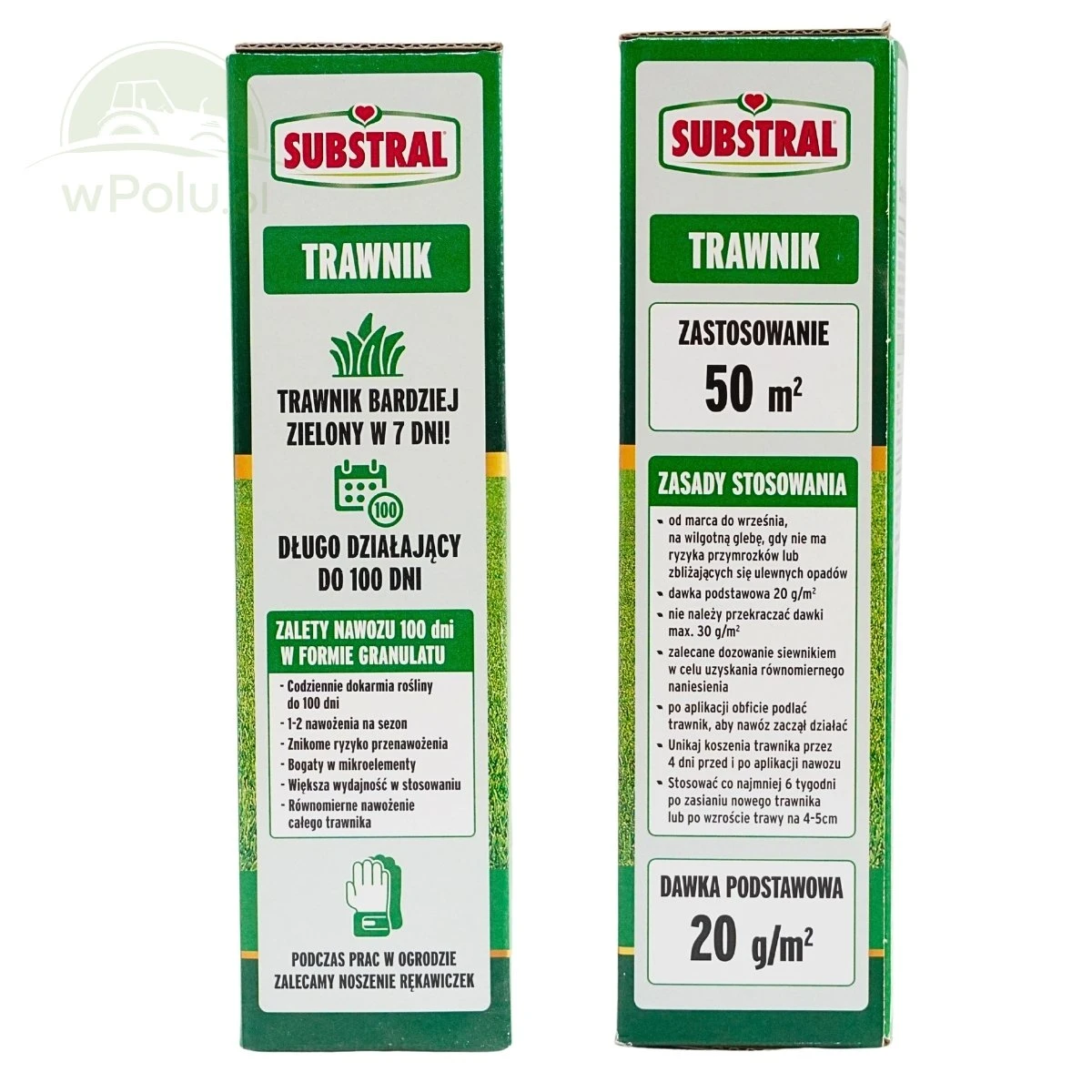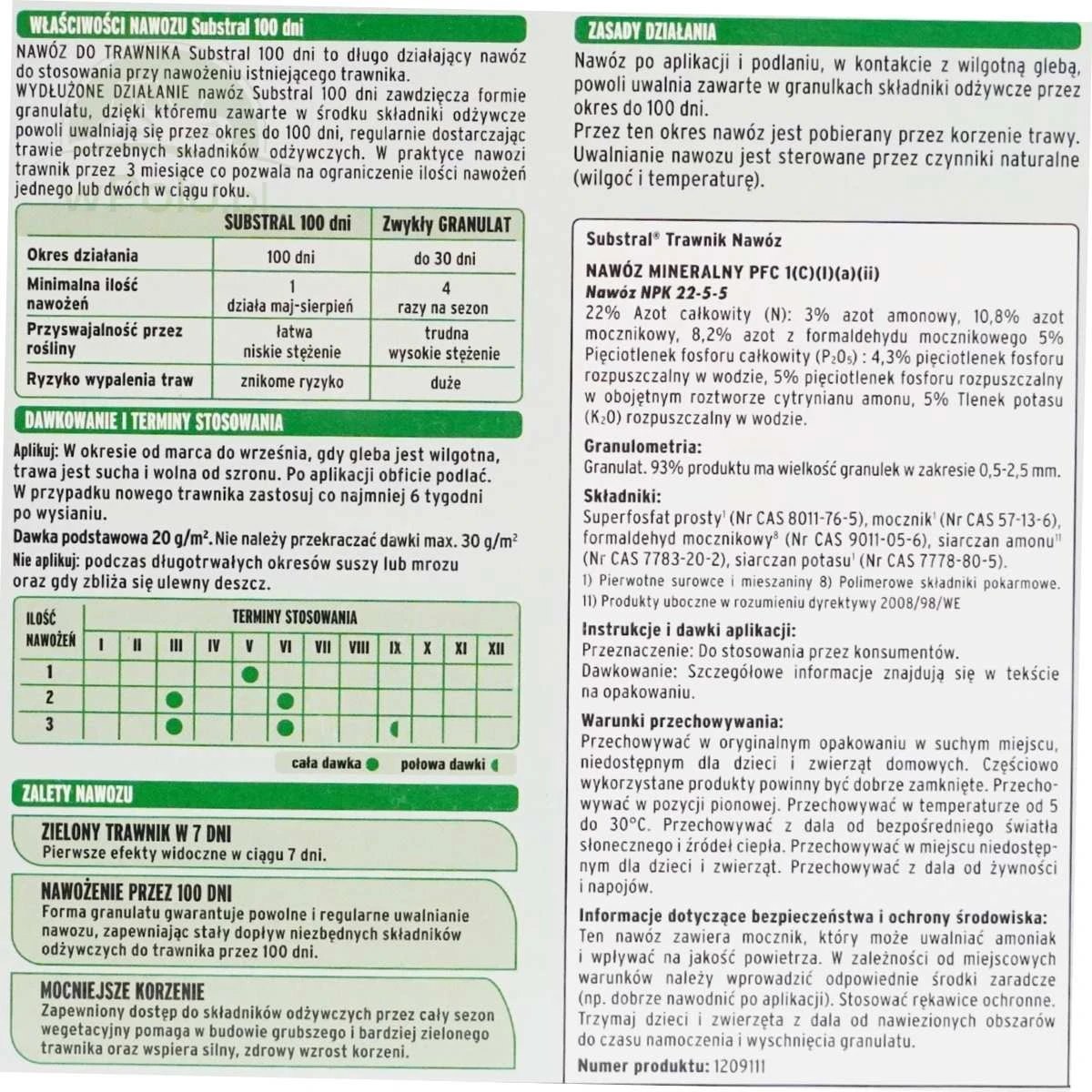 Nawóz Substral 100 dni to długo działający nawóz do trawników, odżywiający murawę przez 100 dni od nawożenia. Dzięki granulacji preparat jest nie tylko wydajniejszy niż inne nawozy o podobnym składzie, ale również gwarantuje stopniowe i stałe dostarczanie składników pokarmowych bez ryzyka przenawożenia. Pod wpływem czynników naturalnych (tj woda i światło słoneczne) granulki nawozu stopniowo rozpadają się i wchłaniają do górnych warstw gleby, uwalniając zawarte w nich substancje pokarmowe. W ten sposób rośliny codziennie otrzymują idealną porcję składników odżywczych. To idealna forma nawożenia dla już istniejących trawników, wspierająca ich bujny i równomierny wzrost trawy, a także jej intensywny kolor i wspaniałą kondycję. Wystarczą maksymalnie dwa nawożenia w sezonie, by cieszyć się gęstym, zielonym dywanem trawy. Pierwszy efekty zabiegu są zauważalne już po 7 dniach.