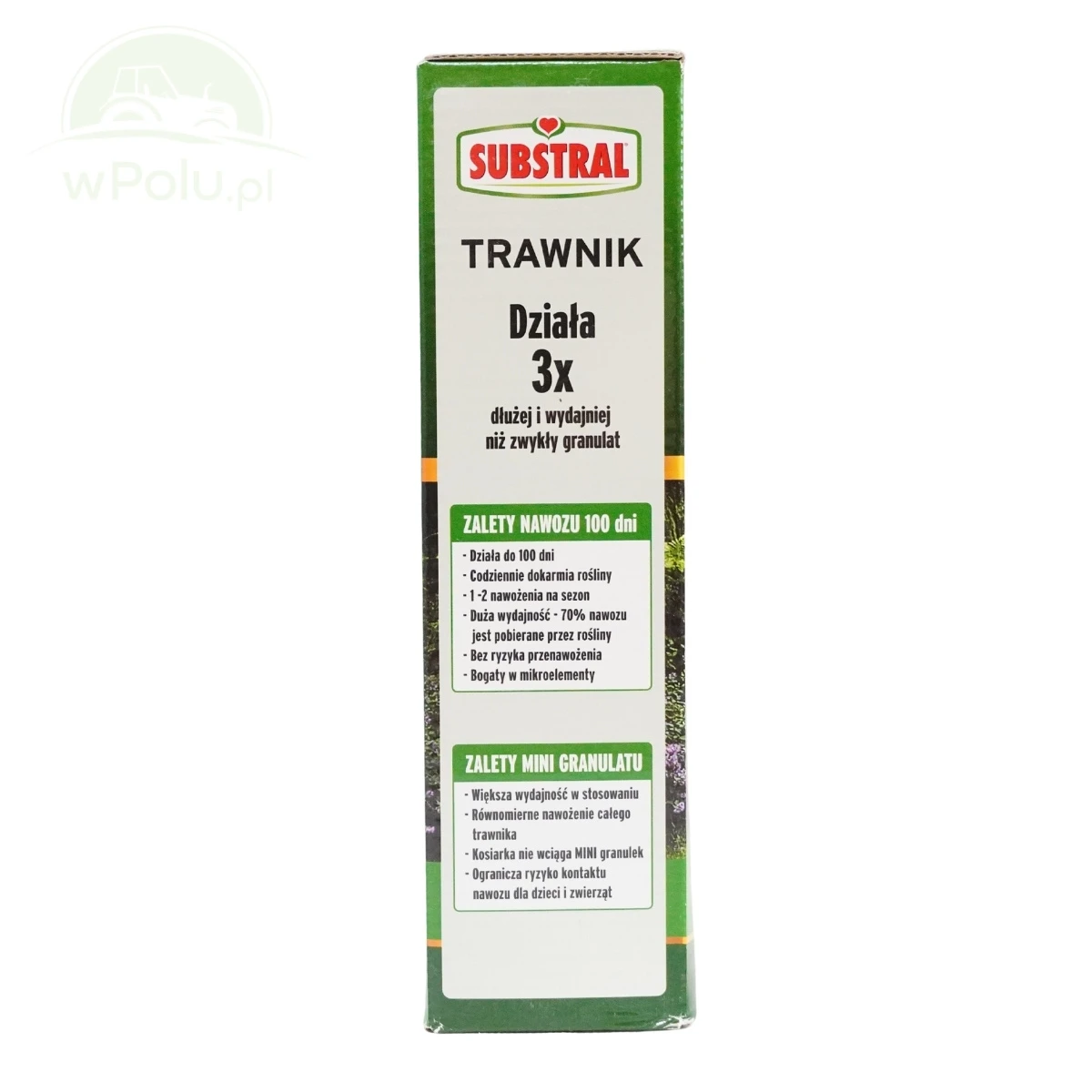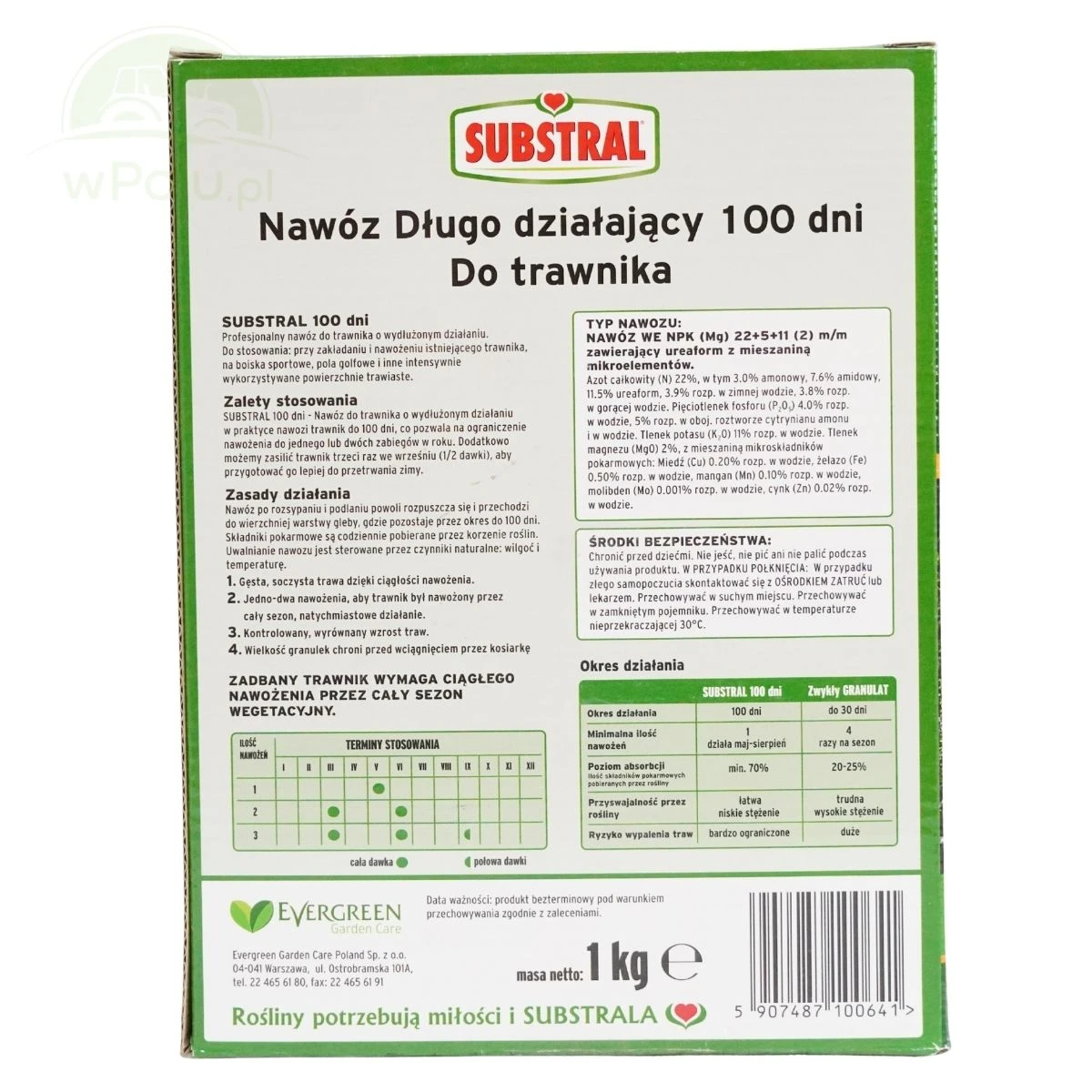 Nawóz Substral 100 dni to długo działający nawóz do trawników, odżywiający murawę przez 100 dni od nawożenia. Dzięki granulacji preparat jest nie tylko wydajniejszy niż inne nawozy o podobnym składzie, ale również gwarantuje stopniowe i stałe dostarczanie składników pokarmowych bez ryzyka przenawożenia.