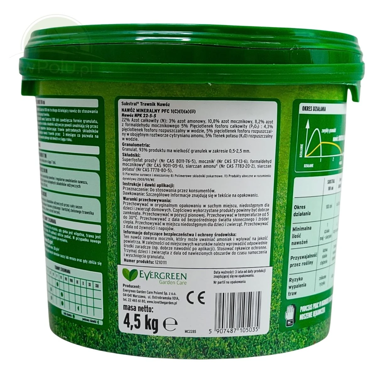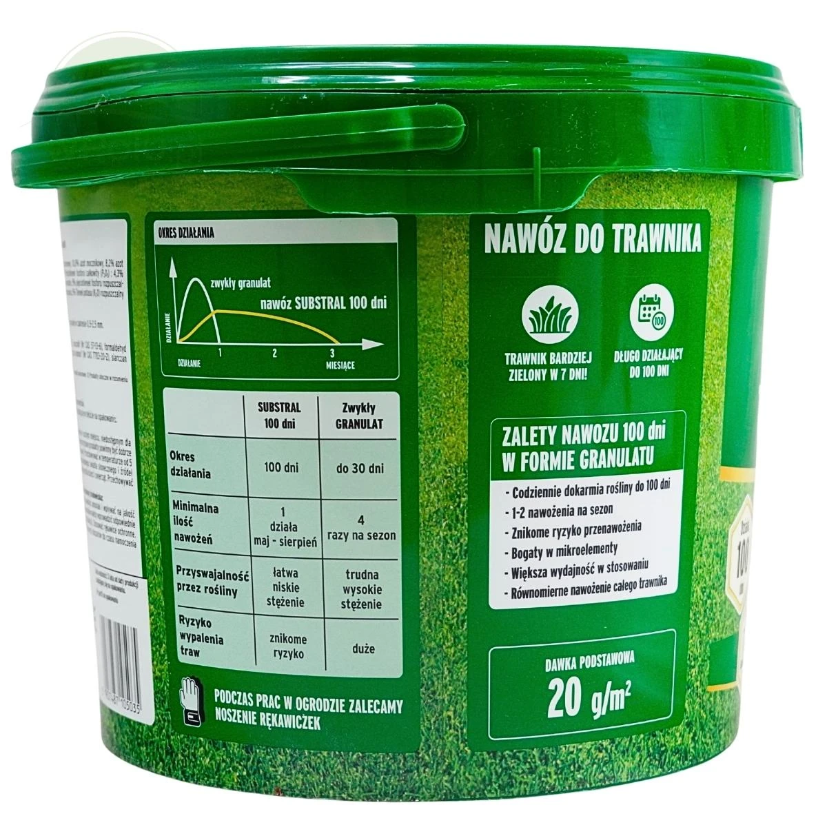 Nawóz Substral 100 dni to długo działający nawóz do trawników, odżywiający murawę przez 100 dni od nawożenia. Dzięki granulacji preparat jest nie tylko wydajniejszy niż inne nawozy o podobnym składzie, ale również gwarantuje stopniowe i stałe dostarczanie składników pokarmowych bez ryzyka przenawożenia. Pod wpływem czynników naturalnych (tj woda i światło słoneczne) granulki nawozu stopniowo rozpadają się i wchłaniają do górnych warstw gleby, uwalniając zawarte w nich substancje pokarmowe. W ten sposób rośliny codziennie otrzymują idealną porcję składników odżywczych. To idealna forma nawożenia dla już istniejących trawników, wspierająca ich bujny i równomierny wzrost trawy, a także jej intensywny kolor i wspaniałą kondycję. Wystarczą maksymalnie dwa nawożenia w sezonie, by cieszyć się gęstym, zielonym dywanem trawy. Pierwszy efekty zabiegu są zauważalne już po 7 dniach.
