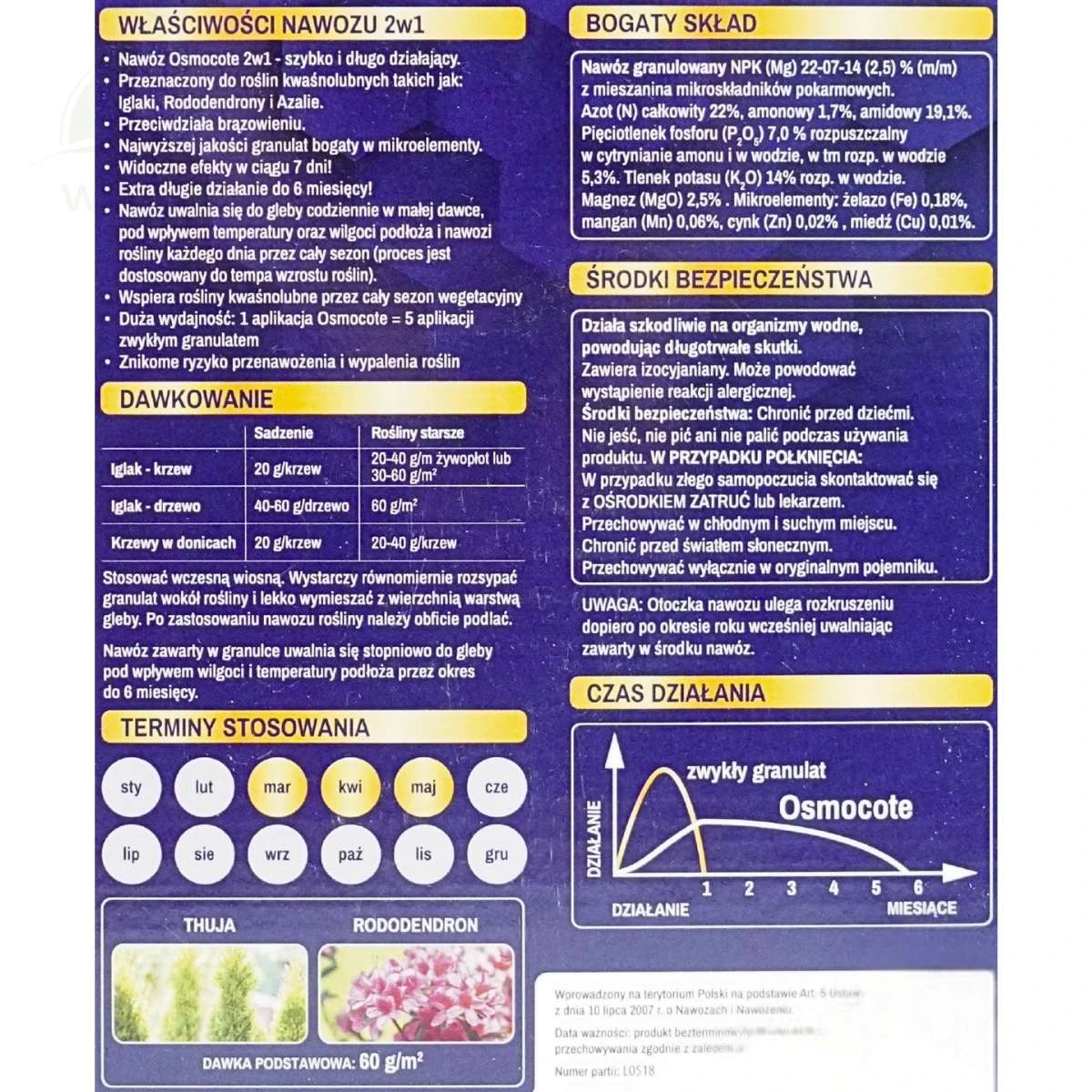 Osmocote 2w1 Iglak to kompleksowy nawóz w postaci granulatu z przeznaczeniem do roślin iglastych i roślin kwaśnolubnych. Formulacja nowej generacji zapewnia roślinom krótko- i długoterminową dostępność składników odżywczych. To wyjątkowa mieszanina powlekanego granulatu o powolnym uwalnianiu oraz niepowlekanych granulek szybko działających. Nawóz niepowlekany natychmiast dostarcza roślinie składniki odżywcze, a efekty widoczne są w 7 dni. Za to powlekane granulki zapewniają stałe uwalnianie składników odżywczych dzięki powłoce z żywicy organicznej. Ta powłoka ochronna zapewnia stałe nawożenie aż do 6 miesięcy oraz brak bezpośredniego kontaktu z korzeniami, które są następnie chronione przed ryzykiem poparzenia i przenawożenia. Przeciwdziała brązowieniu igieł. Osmocote 2w1 Iglak przeznaczony jest do użycia zewnętrznego, w nawożeniu iglaków oraz takich roślin jak rododendrony i azalie.
